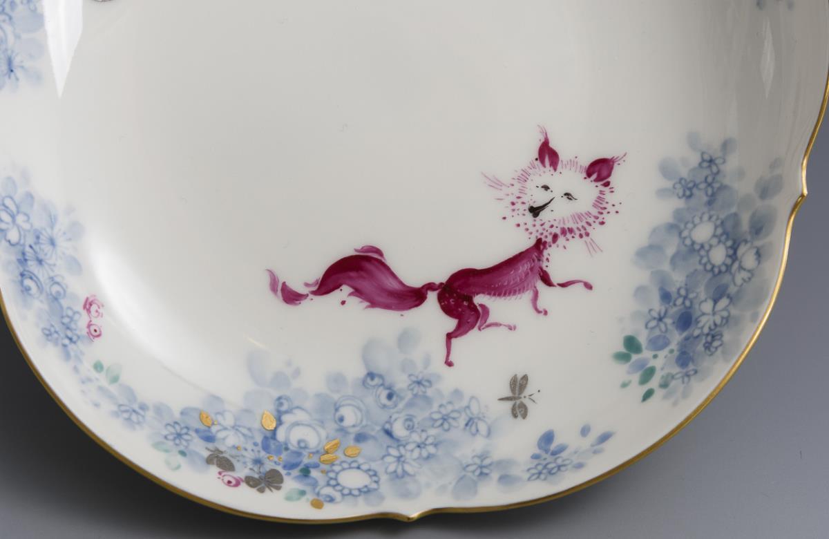 Unter- und aufglasurblaue Malerei, polychrome Malerei, Gold- und Platinstaffage. Ø 14,5 cm.