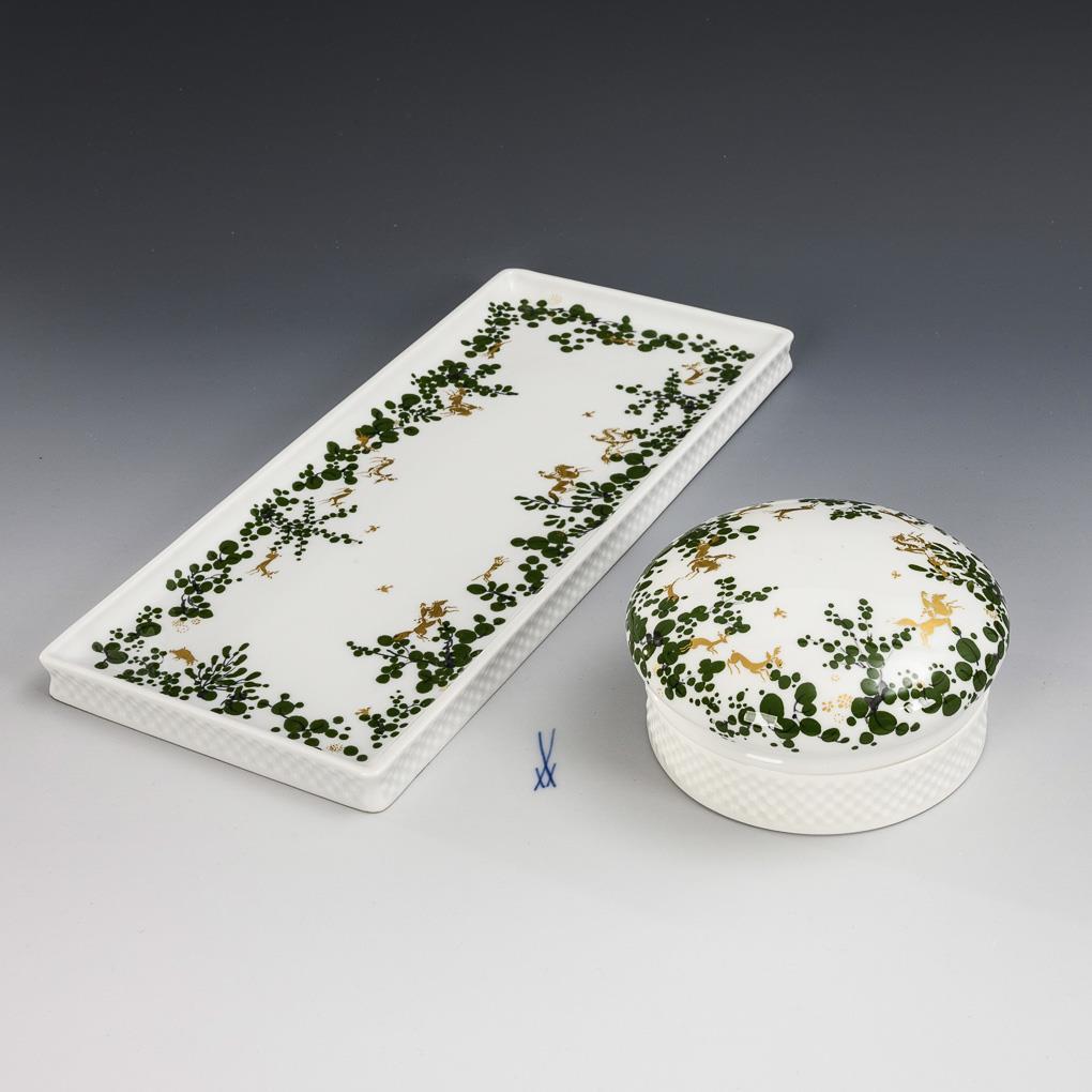 Unterglasurgrüne vegetabile Malerei mit goldgemalten Reitern, Hunden und Wild. Rechteckiges Tablett (13,5 x 30,5 cm) und Dose (H 6 cm, Ø 11 cm).