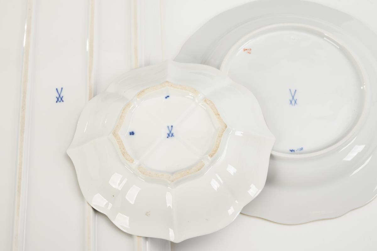 Unterglasurblaue Malerei, polychrome Aufglasurmalerei, Goldstaffage. Königskuchenplatte (L 38,5 cm), Teller (Ø 18 cm) und Schälchen (Ø 13 cm).