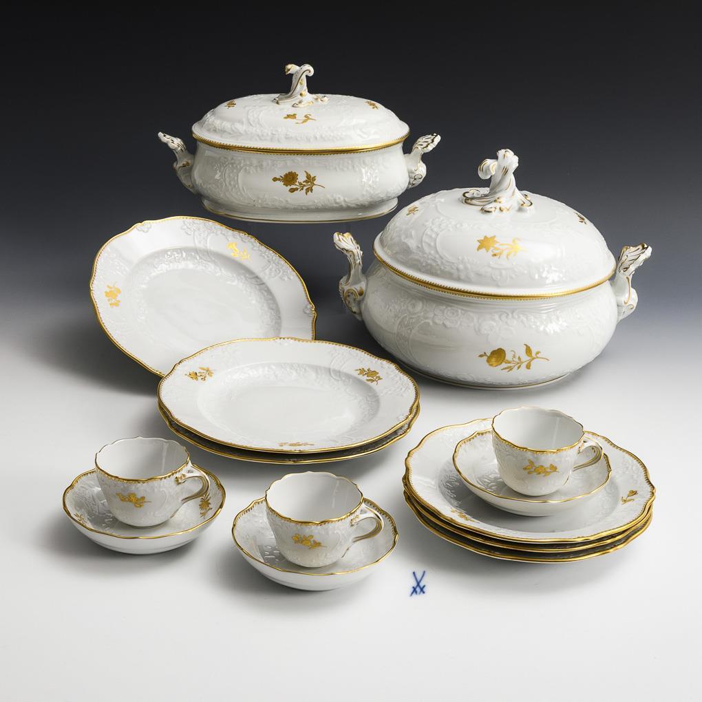 14 Teile. Form "Marseille" mit goldgravierten Blumen. 3 Mokkatassen, 3 Untertassen, 3 Teller (Ø 18,5 cm), 3 Frühstücksteller (Ø 21,5 cm), 1 ovale Terrine (L 28,5 cm) und 1 runde Terrine (Ø 30 cm).