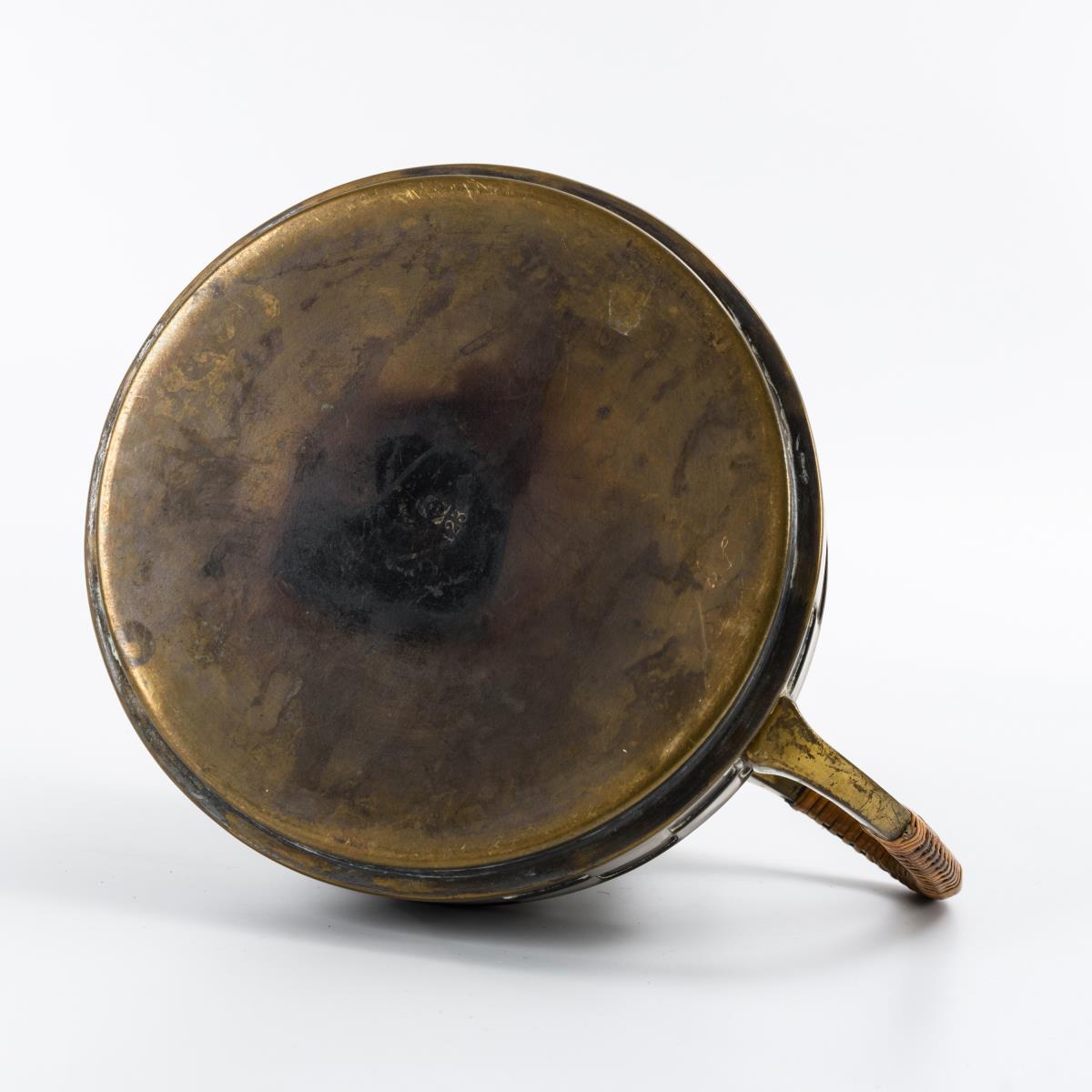 Martellierung am Rundfuß und an der Kanne, hier zusätzlich geometrisches Friesband sowie Henkel mit Bastwicklung. Lötstelle Deckelscharnier gelöst, Brenner (ohne Docht) ergänzt.
