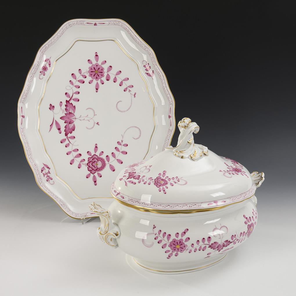 Purpurfarbene Malerei, Goldstaffage. Terrine (L 35,5 cm), Tablett (L 42,5 cm).