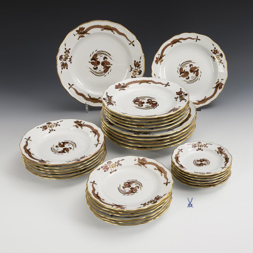 Polychrom bemalt, goldstaffiert. Ø 6x 25 cm, 6x 22 cm, 6x 20 cm, 6x 18 cm, 6x 13,5 cm.