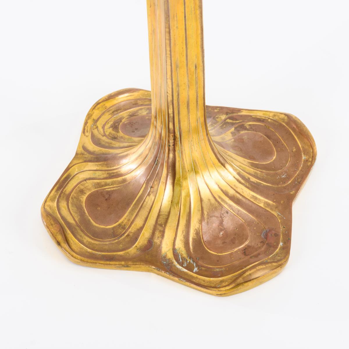 In starker Stilisierung vegetabil geformter Kerzenleuchter mit erhöhter Zentraltülle. Berieben, 1 Tülleneinsatz fehlt, 1 Arm leicht verbogen.