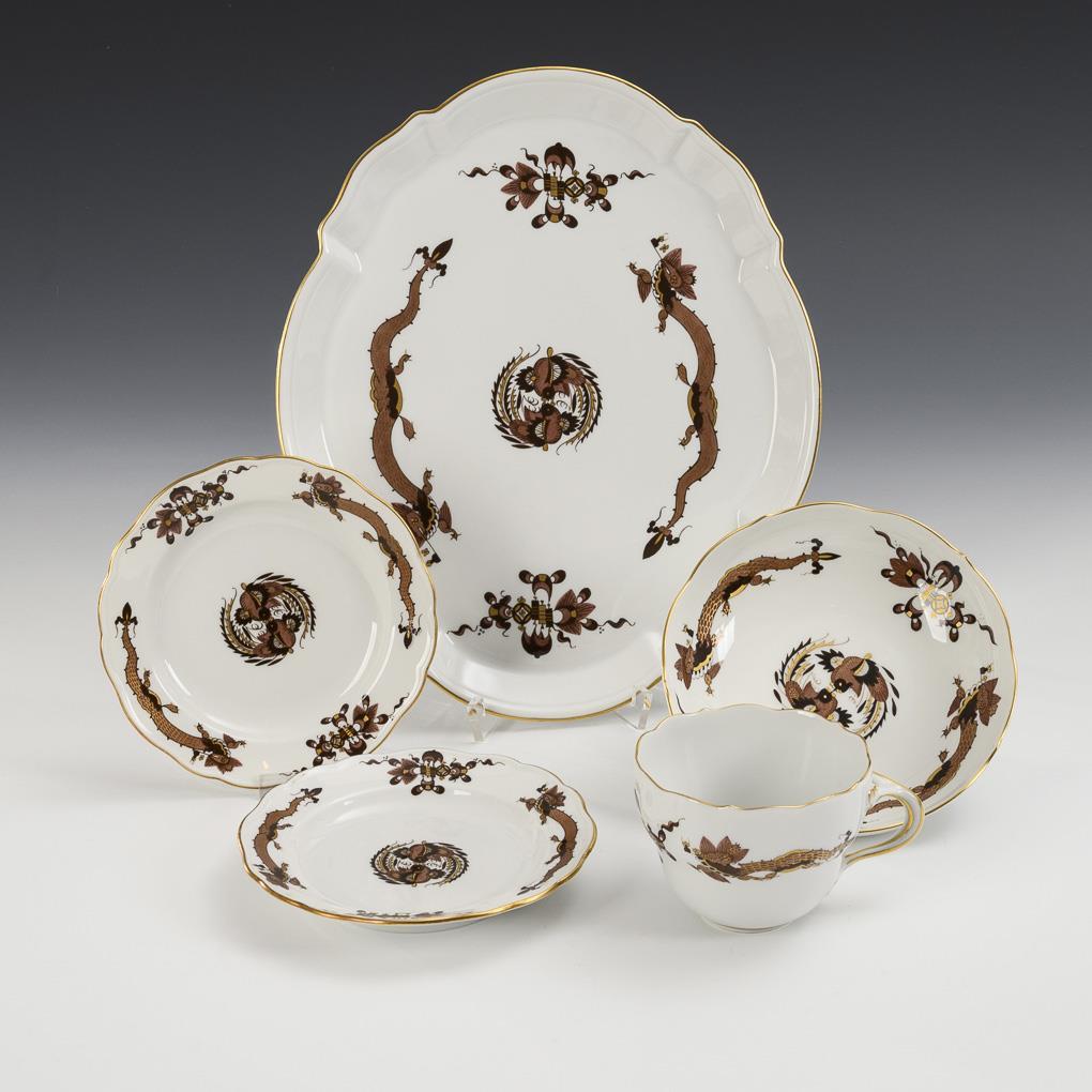 Form "Neuer Ausschnitt". Kaffeetasse mit Untertasse, 2 kleine Teller (Ø 14 cm) und Tablett (L 27,5 cm).