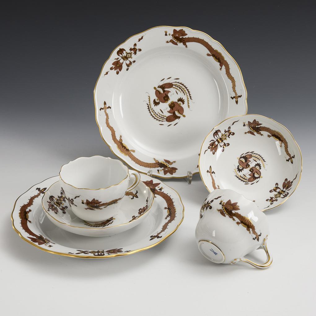 Braun- und goldstaffiert. 2 Tassen (H 6,5 cm), 2 Untertassen (Ø 14,5 cm) und 2 Frühstücksteller (Ø 22 cm).