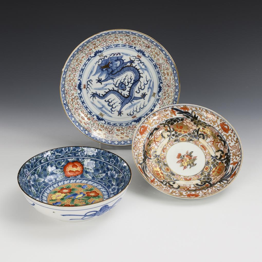 Alle mit Unterglasur-Blaumalerei und weiterer Bemalung. Größere Schale mit Drachendekor, Rand mit Reiskornmuster. Ø 23,5 cm. / Tiefe Schale gemarkt, kräftige Farbgebung durch Druckdekor. Ø 19 cm. / Gestufte Schale mit Rot- und Goldmalerei. Ø 20,5 cm.
