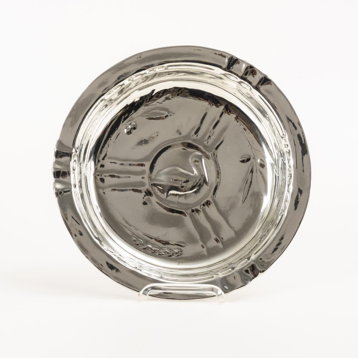 Runde Schale mit Reliefdekor: Pelikan, Oliven, Lorbeer und Getreide.