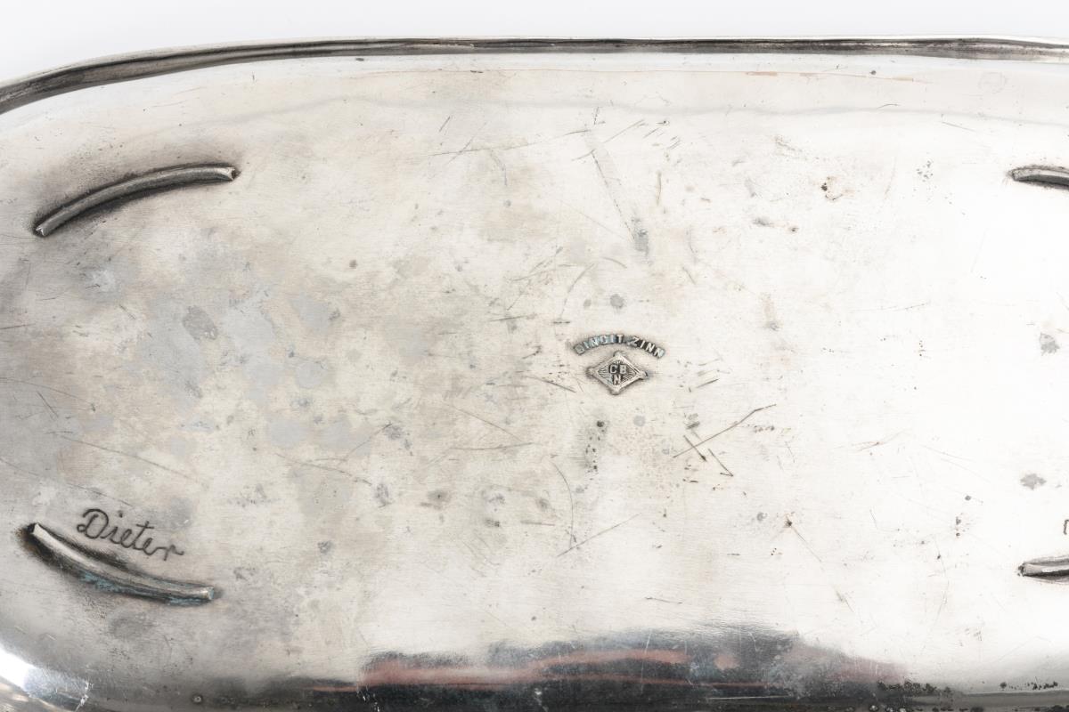 Schmales Tablett und runde Schale mit geometrischem, Sauciere mit floralem Relief. Tablett am Boden Gravur "Dieter Zürl", Schale ebd. Etikett "Sammlung Langer". Kelle mit Muschellaffe und reliefiertem Kupfergriff. Ausblühungen an der Sauciere, sonst wenige Alters-/ Gebrauchsspuren.
