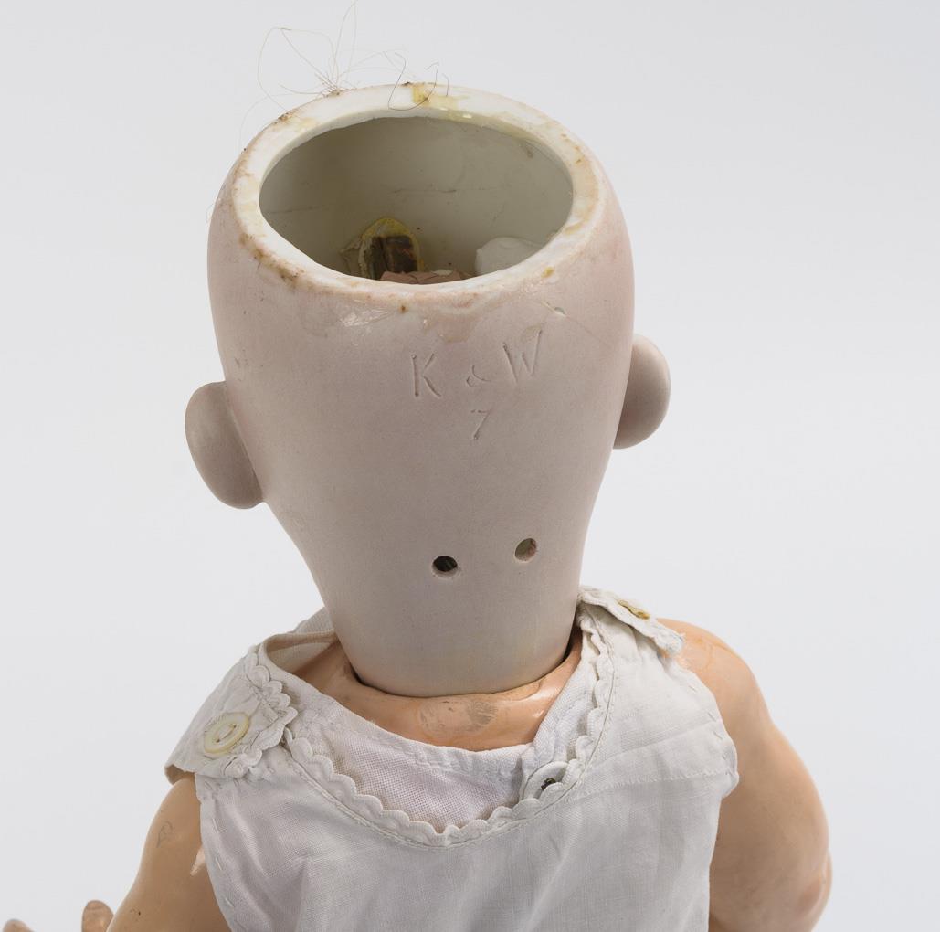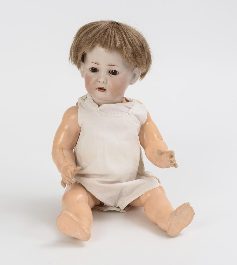 Kurbelkopf, braune Schlafaugen, aschblonde Echthaarperücke, 5-teiliger Stehbabykörper mit verstummter Stimme. In weißem Hemdchen. Haarriss mit 2 winzigen Chips am Hinterkopf.