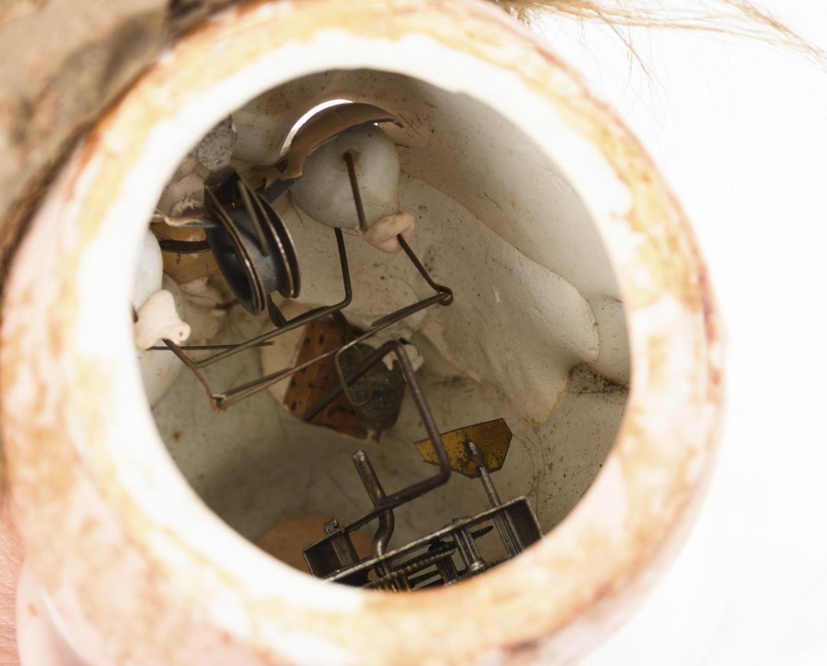 Kurbelkopf, blaue Schlaf-/Schelmenaugen, hellbraune Echthaarperücke. Intakter Mechanismus, der die Augen hin und her blicken lässt, mit Schlüssel. 5-teiliger Sitzbabykörper mit verstummter Stimme. Weißer Mantel, hellblaue Strickschuhe. Kopf durchleuchtet: ohne Defekte.