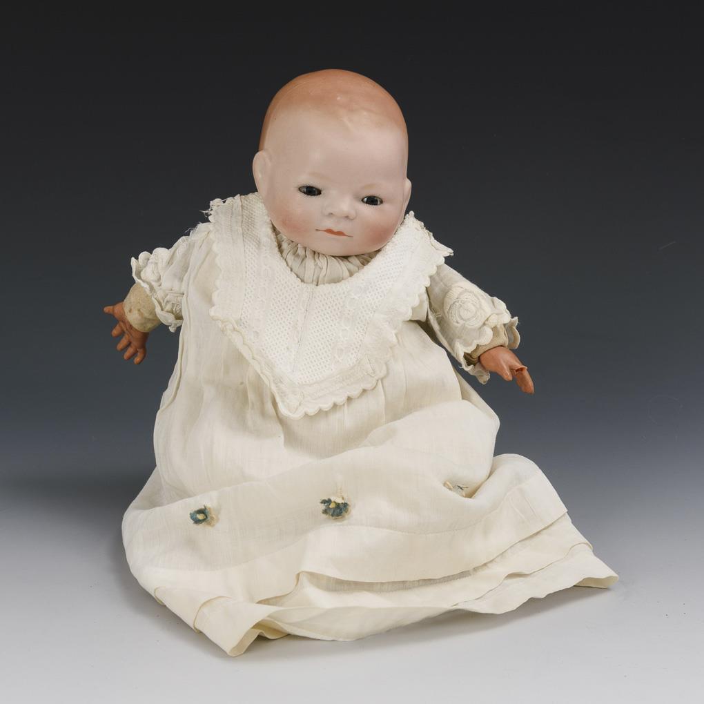 Einbindekopf, schmale blaue Schlafaugen, geschlossener Mund, braun getönter Haarboden. Stoffkörper mit Celluloidhänden. Weißes Kleid, Lätzchen und weißer Strickstrampler. 1 Finger links fehlt, Stimme verstummt.