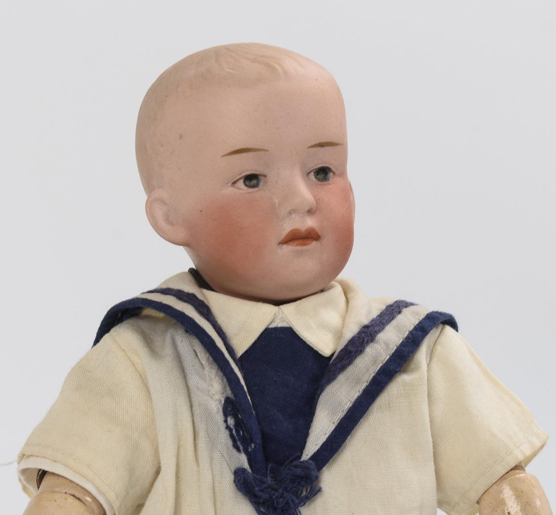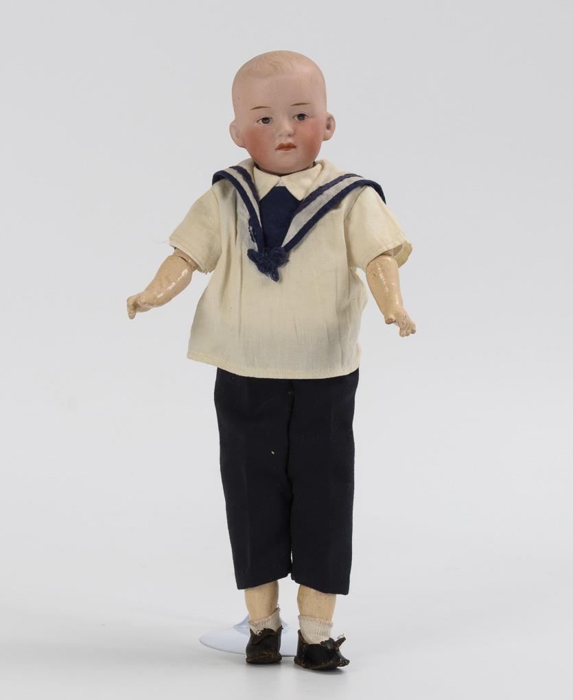 Kurbelkopf, gemalte blaue Augen, geschlossener Mund, heller Haarboden. 9-teiliger Gliederkörper. Blau-weißer Matrosenanzug. Kopf ohne sichtbare Defekte. Finger bestoßen, Beine mit Farbdefekten.