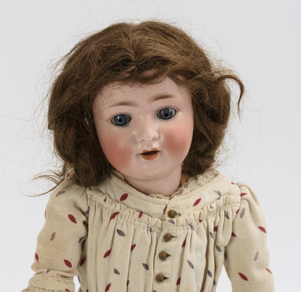 Kurbelkopf, blaue Schlafaugen, braune Echthaarperücke. 13-teiliger Gliederkörper mit gemarkten Celluloid-Händen von Schildkröt (SoR). Helles Kleid mit bunten Blättern. Kopf durchleuchtet: ohne Risse. Kleine Chips an den unteren Lidrändern.