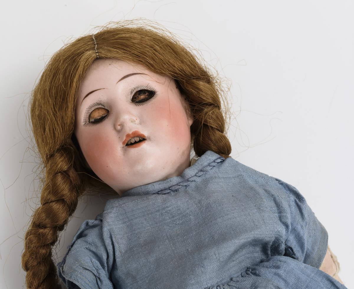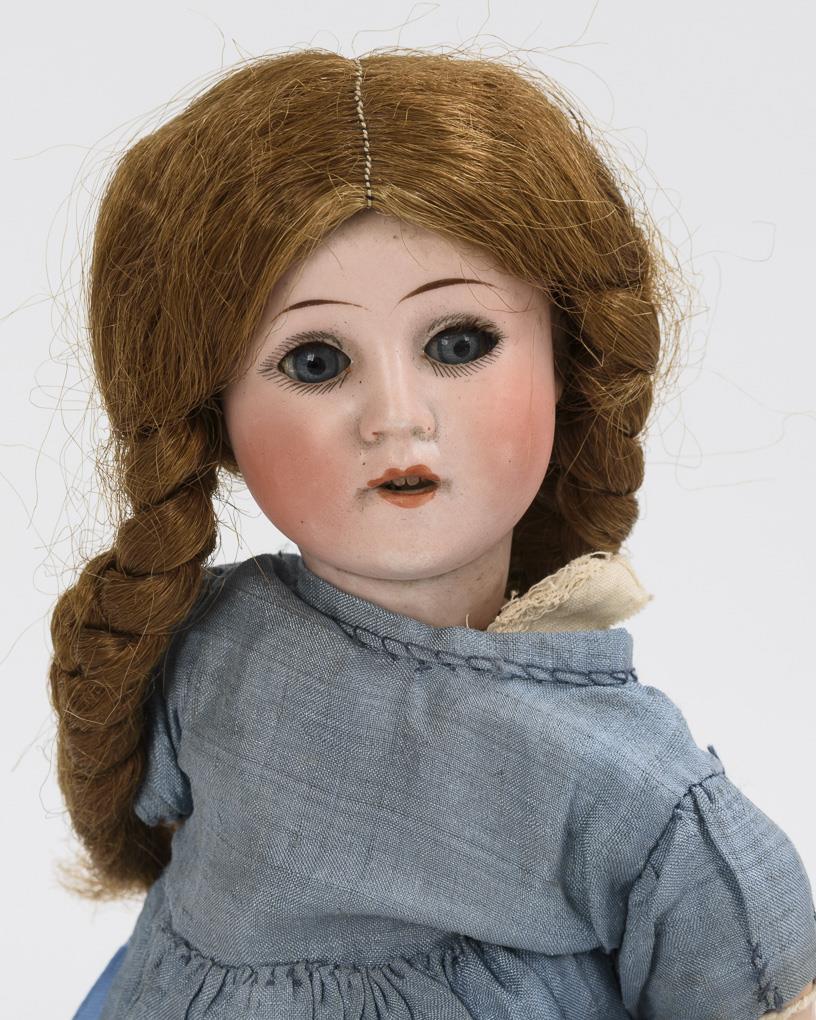 Kurbelkopf, blaue Schlafaugen, Wimpern, braune Kunsthaarperücke mit Zöpfen. 13-teiliger Gliederkörper mit losen Armen. Blaues Kleid, gehäkelte hellblaue Schuhe. Kopf durchleuchtet: ohne Defekte.