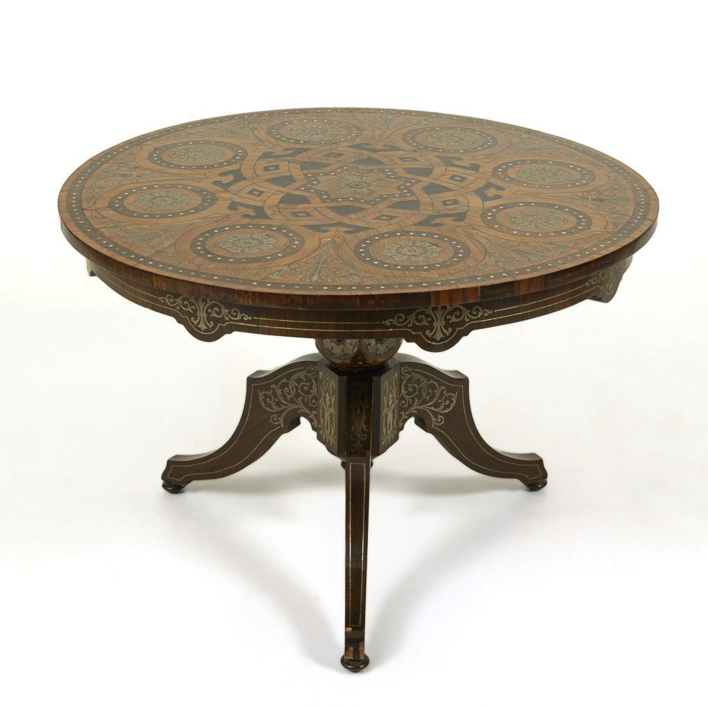 Aufwendig intarsierter runder Salontisch im Barock-Stil.