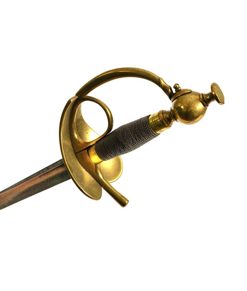 Gerade einschneidige Klinge mit breitem Hohlschliff, in der Spitze zweischneidig und mit doppeltem Hohlschliff. Klingenrücken abgerundet. Messinggefäß mit herzförmigem, hochgezogenem Stichblatt, großem Fingerring und Kugelknauf mit Petschaft-Scheibe. Griff mit dichter Drahtwicklung (oder aus einem Stück gegossen?).