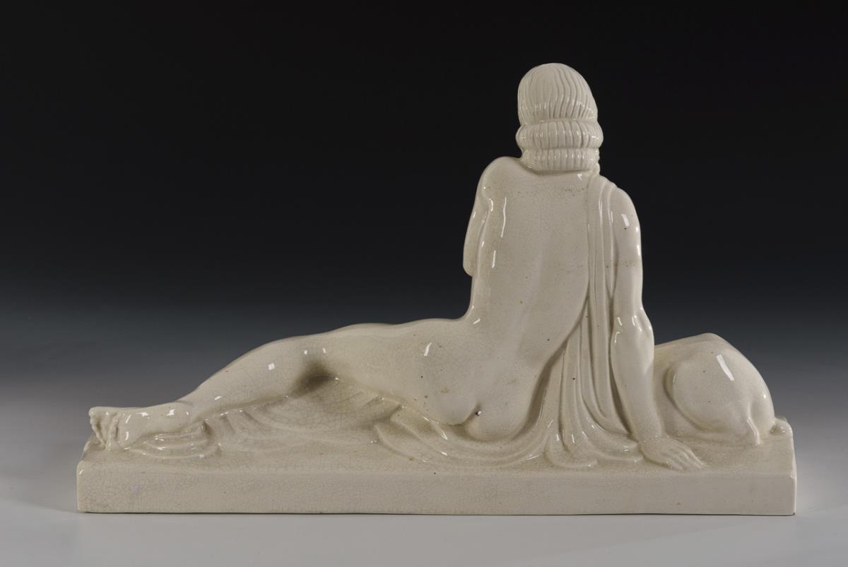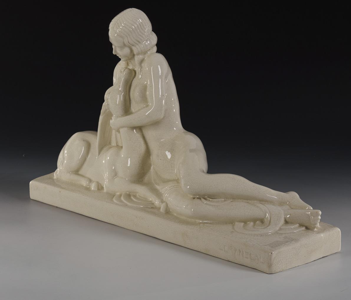 Liegender Mädchenakt beim Liebkosen einer Gazelle, auf Rechtecksockel.