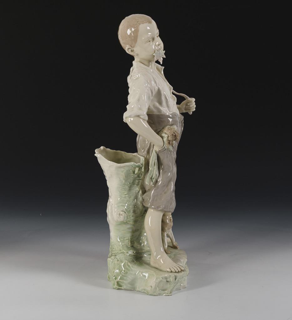 Jugendstil-Plastik eines Jungen mit Weinblatt im Mund, an einem ausgehöhlten Vasen-Baumstumpf stehend, mit kleinem Hund. Restauriert an den Beinen, Hosenträger, Hund, Baumstumpf und Sockel.