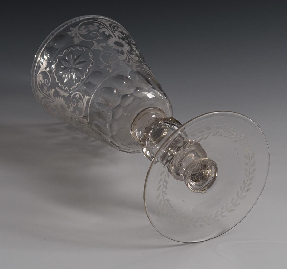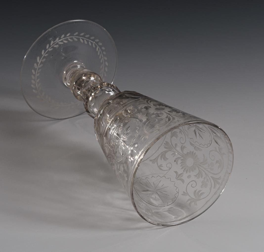Konische, am Ansatz facettierte Kuppa, wabenfacettierter Hohlbalusterschaft, Rundfuß; Abriss. Auf der Kuppa floral-ornamentale Gravur.