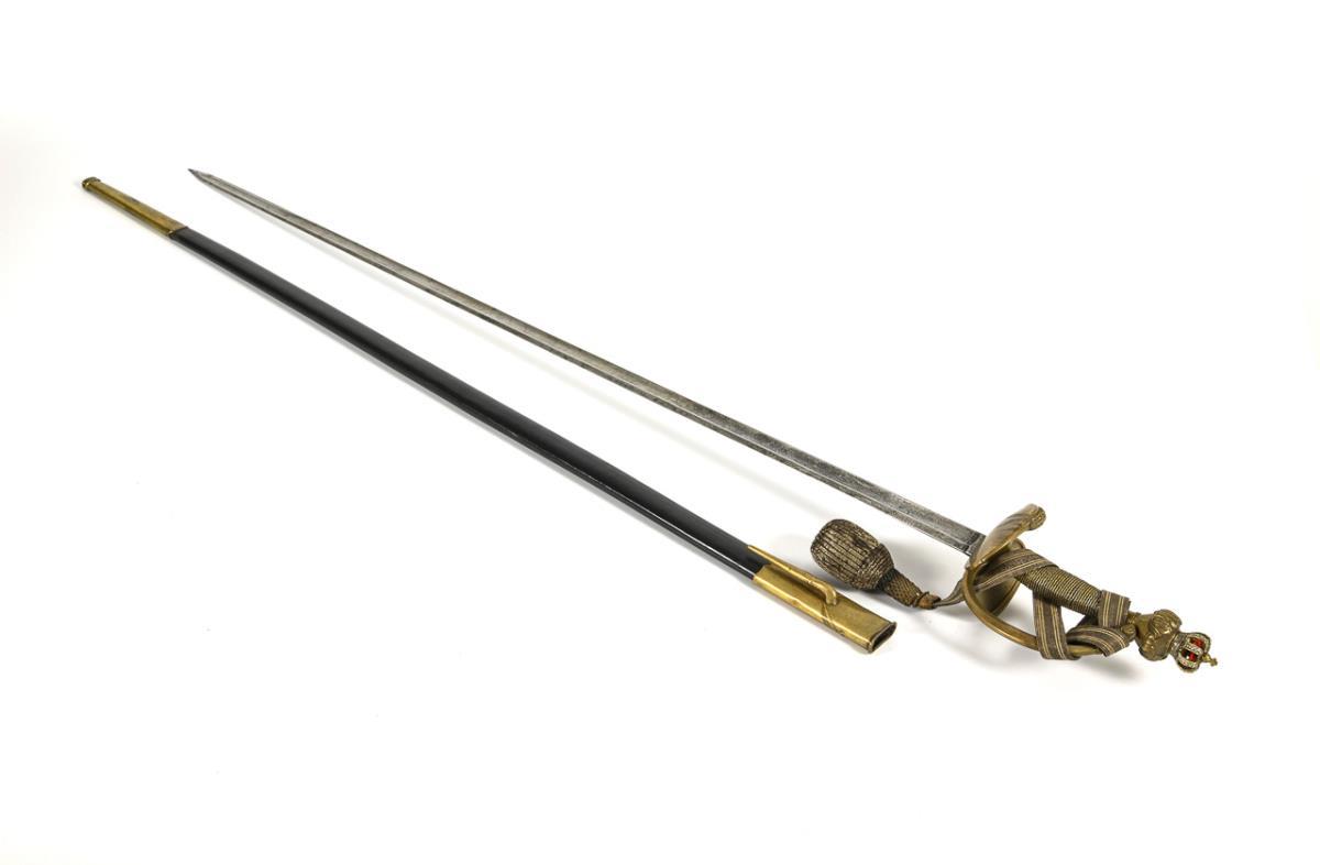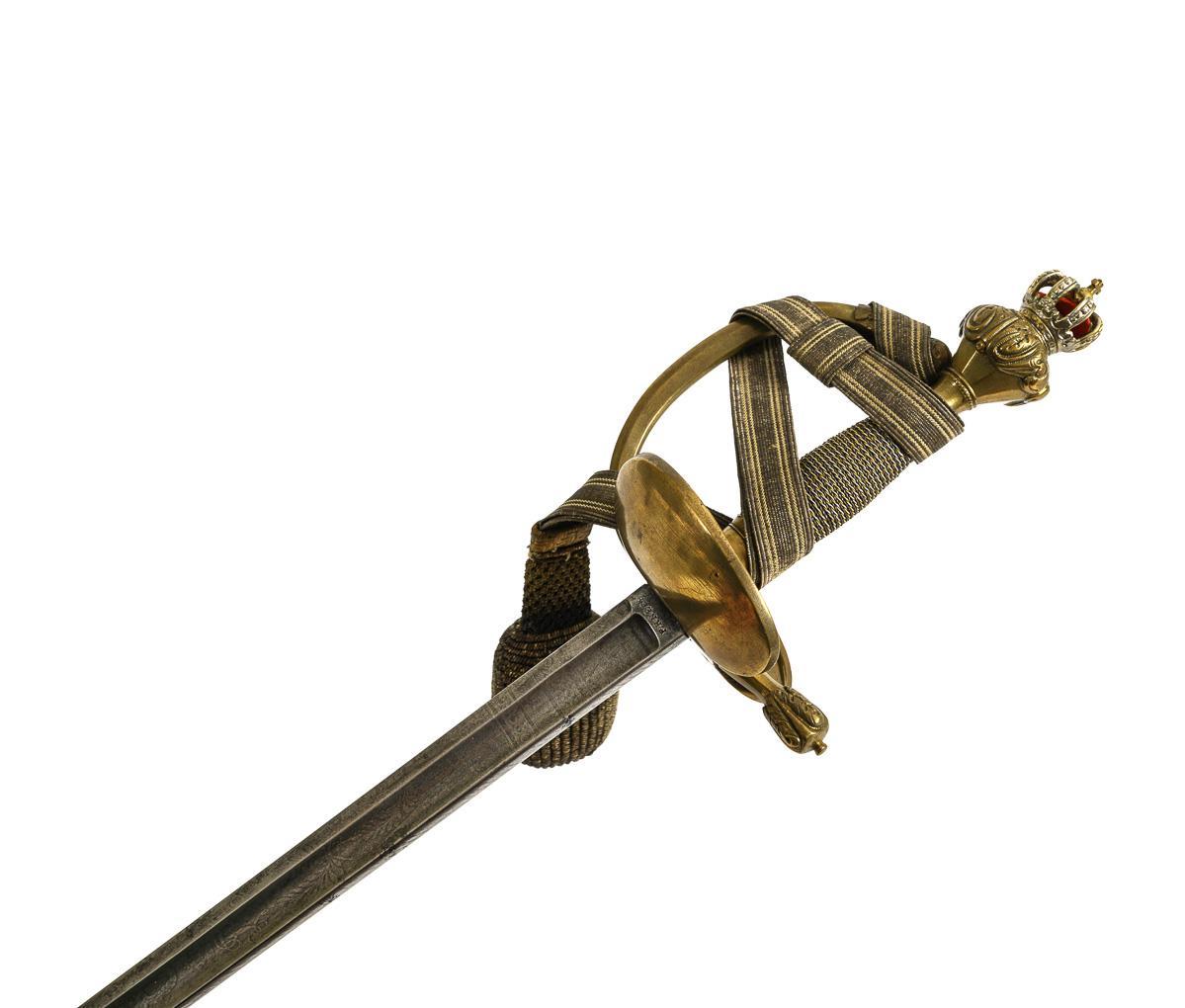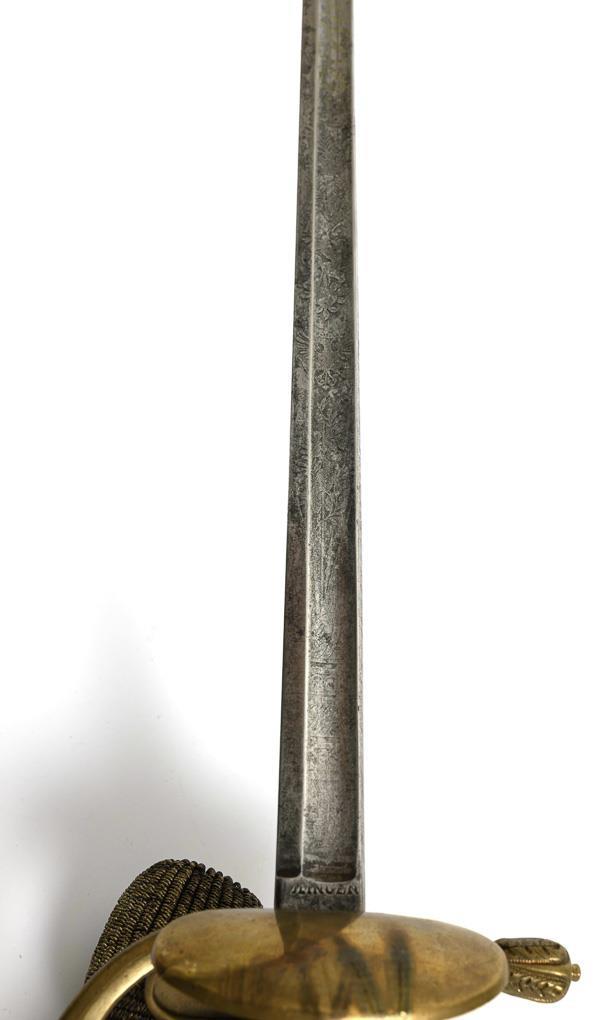 Gerade, einschneidige Klinge mit breitem Hohlschliff, Spitze in der Mittellinie. Beidseitig etwas verputztes Ätzmuster, mit bekröntem Monogramm "FWR". Griff des IOD alter Art mit Krone als Knaufende. Hier wohl nachträglich roter Filz in die Krone eingelegt (lose). Schwarze Lederscheide mit Haken und Portepee.