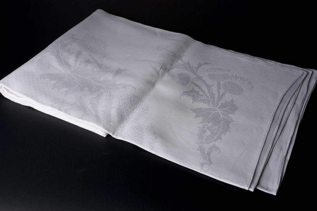 Breites Oval mit Dekor aus großen Distelzweigen und -blüten. Zwischenräume mit Pünktchendekor.