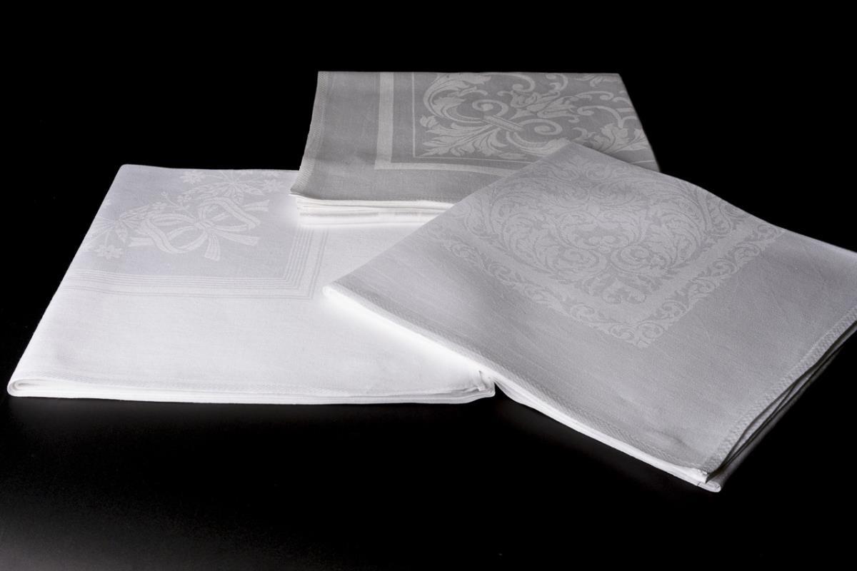 Leinendamast. 128 x 128 cm.