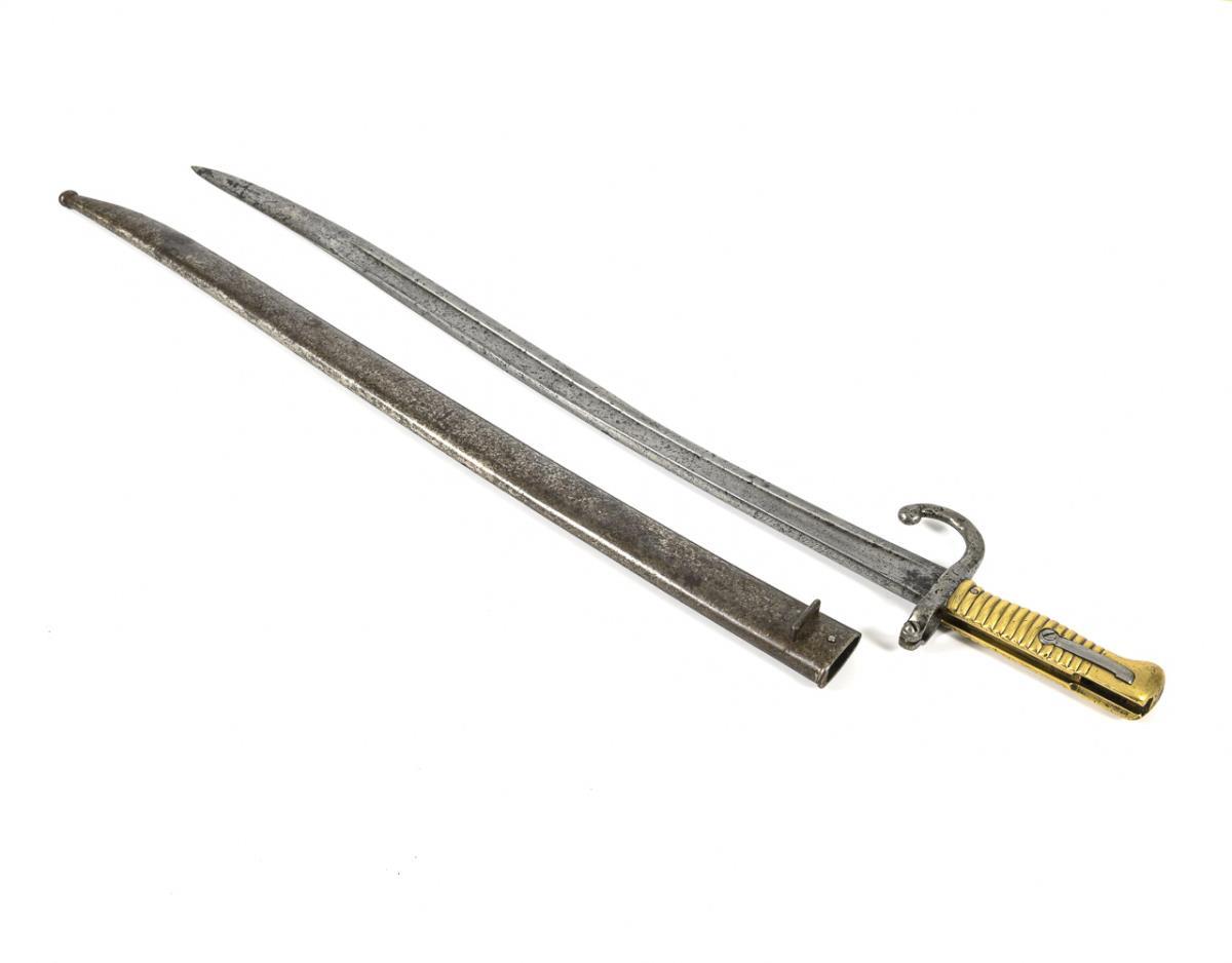 Seitengewehr zum Gewehr M71. Yataganklinge mit breitem Hohlschliff und verstärktem Rücken. Gerippter Messinggriff. Blanke Metallscheide mit eckiger Öse. Leichte Korrosionsnarben.