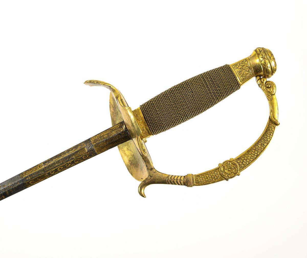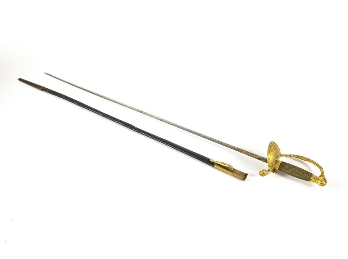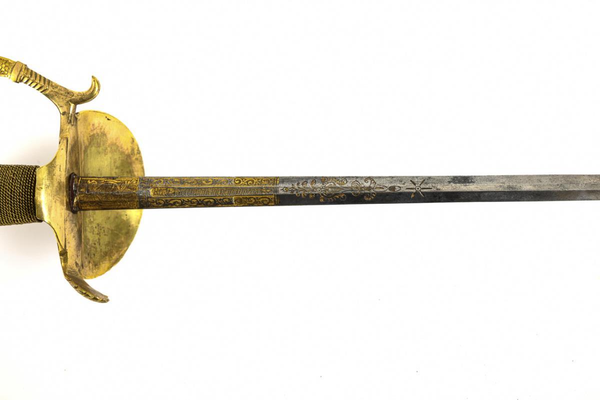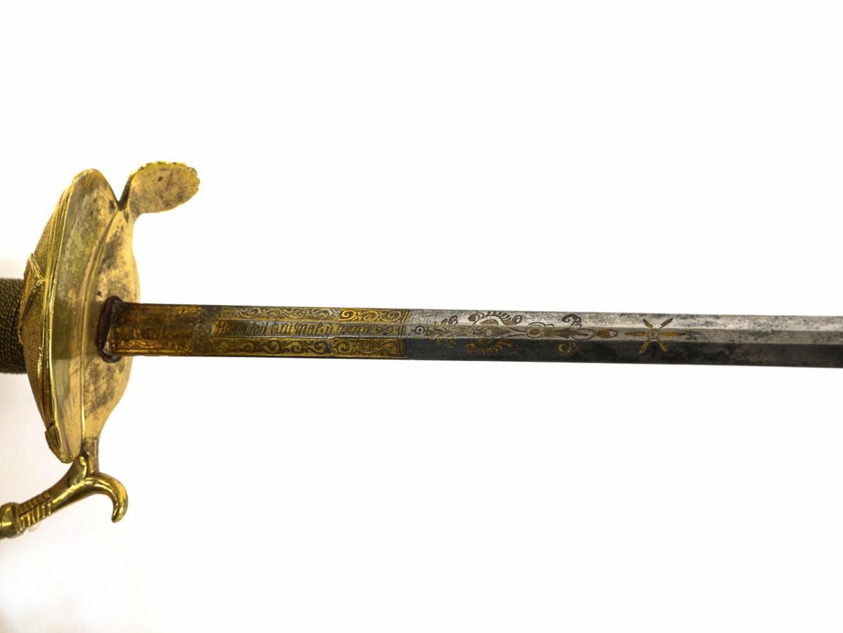 Schmale, zweischneidige Klinge mit achtkantigem Querschnitt. Gravierte und teils vergoldete Musterung mit folgenden Inschriften: "RECTE FACIENDO NEMINEM TIMEAS“ / „HONNI(sic) SOIT QUI MAL Y PENSE" und "Nec temere, nec timide", geteilt auf beide Klingenseiten. Vergoldetes Gefäß mit bekröntem sächsischen Wappen. Spange in Delfinform. Griff mit Drahtwicklung. Schwarze Lederscheide mit Haken. Scheide nicht dazugehörig, letzte Inschrift durch Scheide leicht beschädigt.