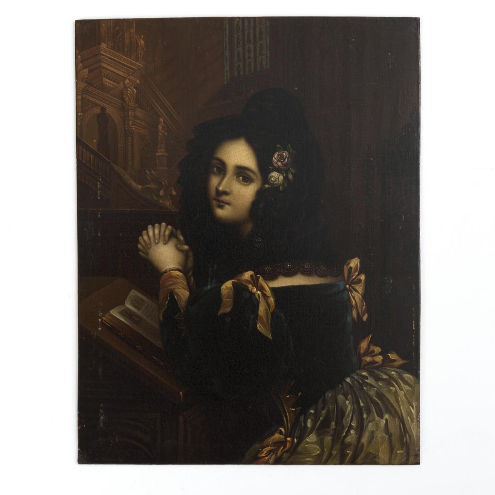 In der Kirche vor aufgeschlagenem Buch betende junge Frau im Biedermeier-Kostüm, die über die Schulter zum Betrachter schaut. Nach dem Gemälde "Rosina en prière" von Guillaume Lepaulle. / Rahmen mit Zierreliefs. Wenige Farbabsplitterungen, minimal krakeliert. / Rahmen geringe Alters-/Gebrauchsspuren.