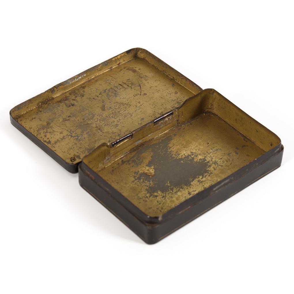 Eisenblech außen schwarz lackiert, innen goldbronziert, auf dem Scharnierdeckel Lackmalerei. 3 x 12,5 x 8 cm.