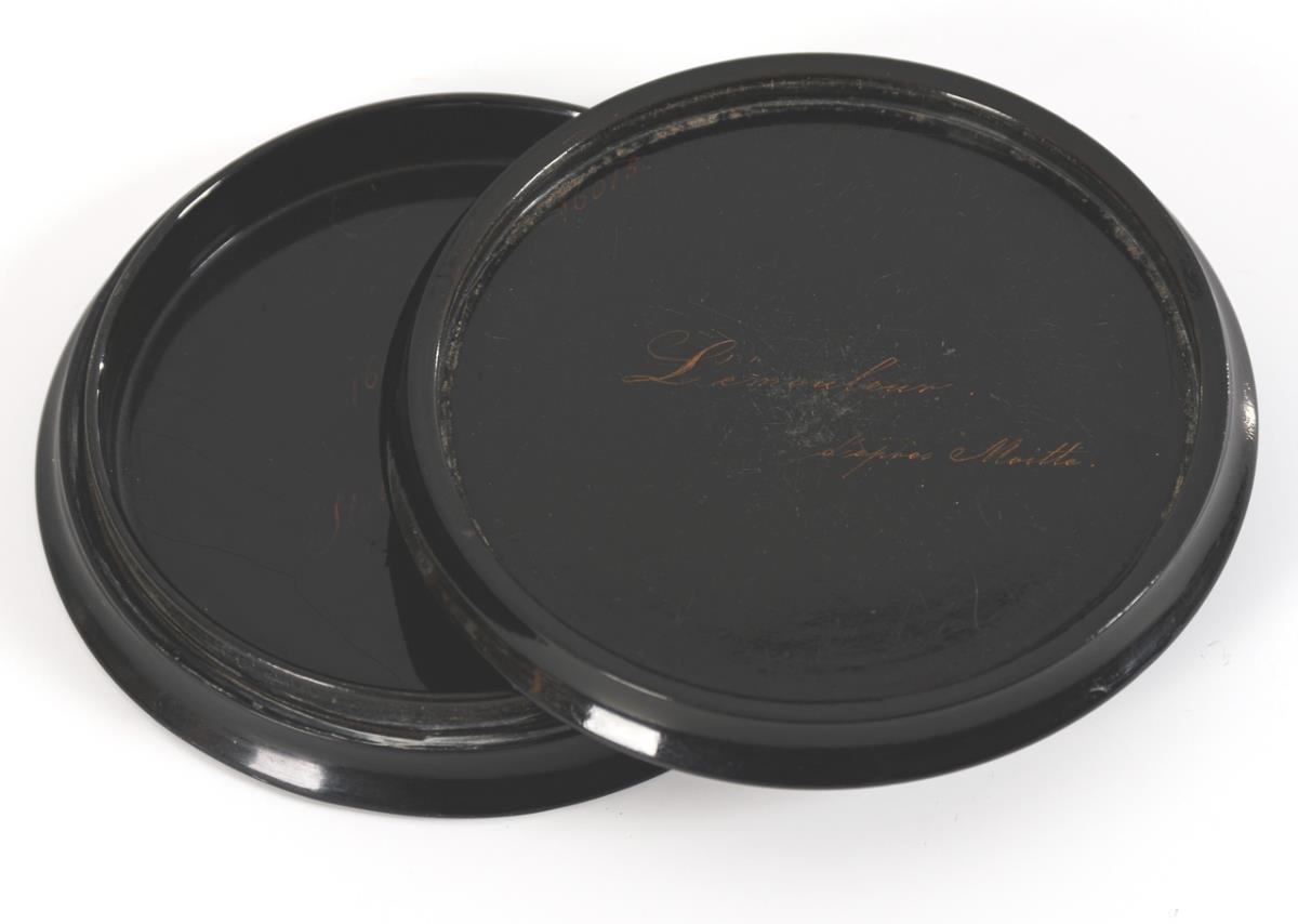 Papiermaché schwarz lackiert, Lackmalerei. H 1,8 cm, Ø 10 cm.