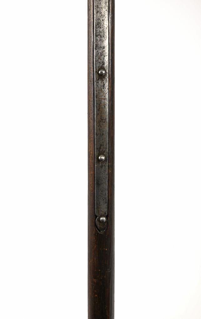 Zweischneidige Klinge mit Mittelgrat, runde Tülle mit dreifacher Gliederung, Befestigung am Holzschaft mit zwei langen Bändern. Holzschaft wohl unten abgesägt.