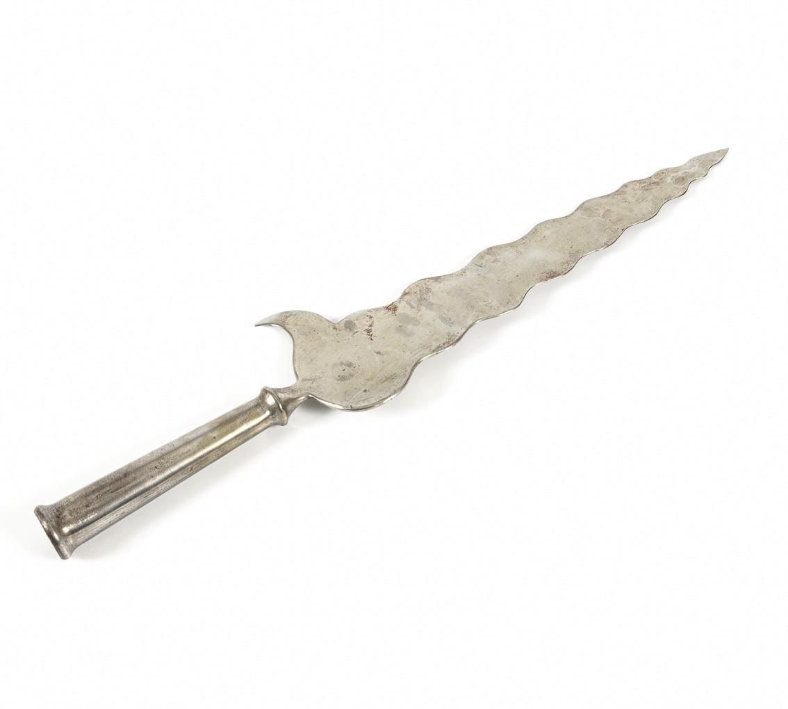 Breite, zweischneidige Klinge mit leichtem Mittelgrat. Tüllenhalterung.