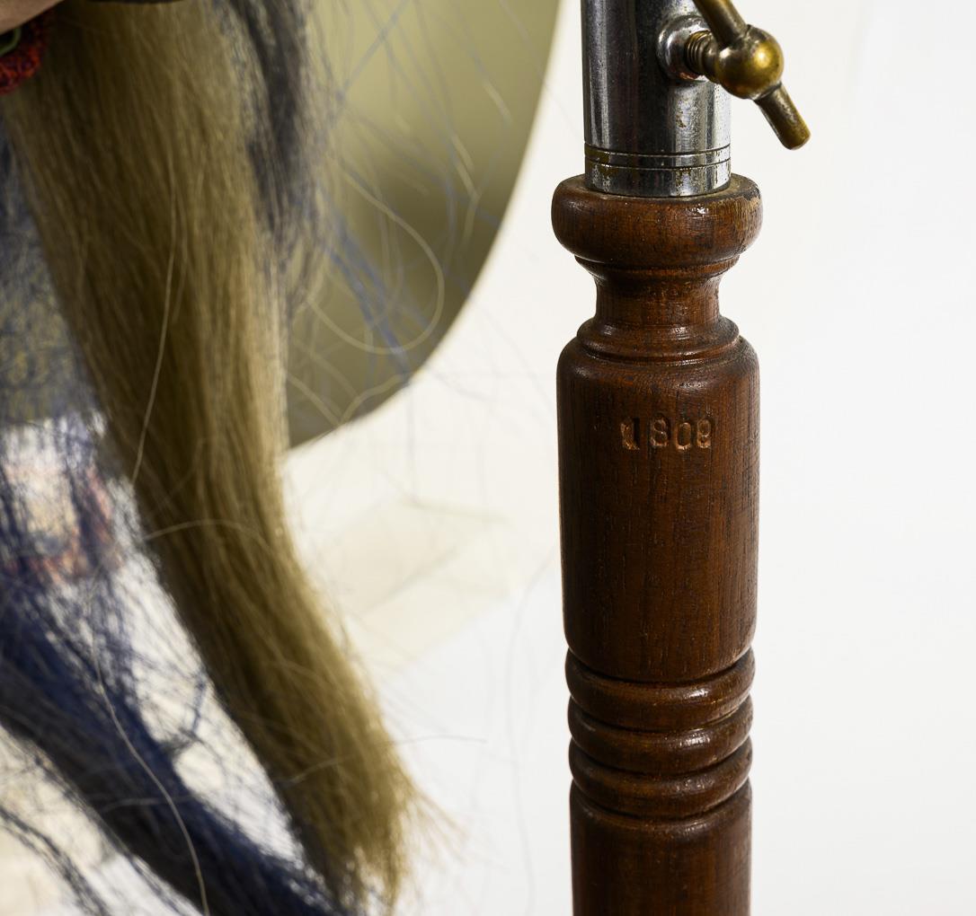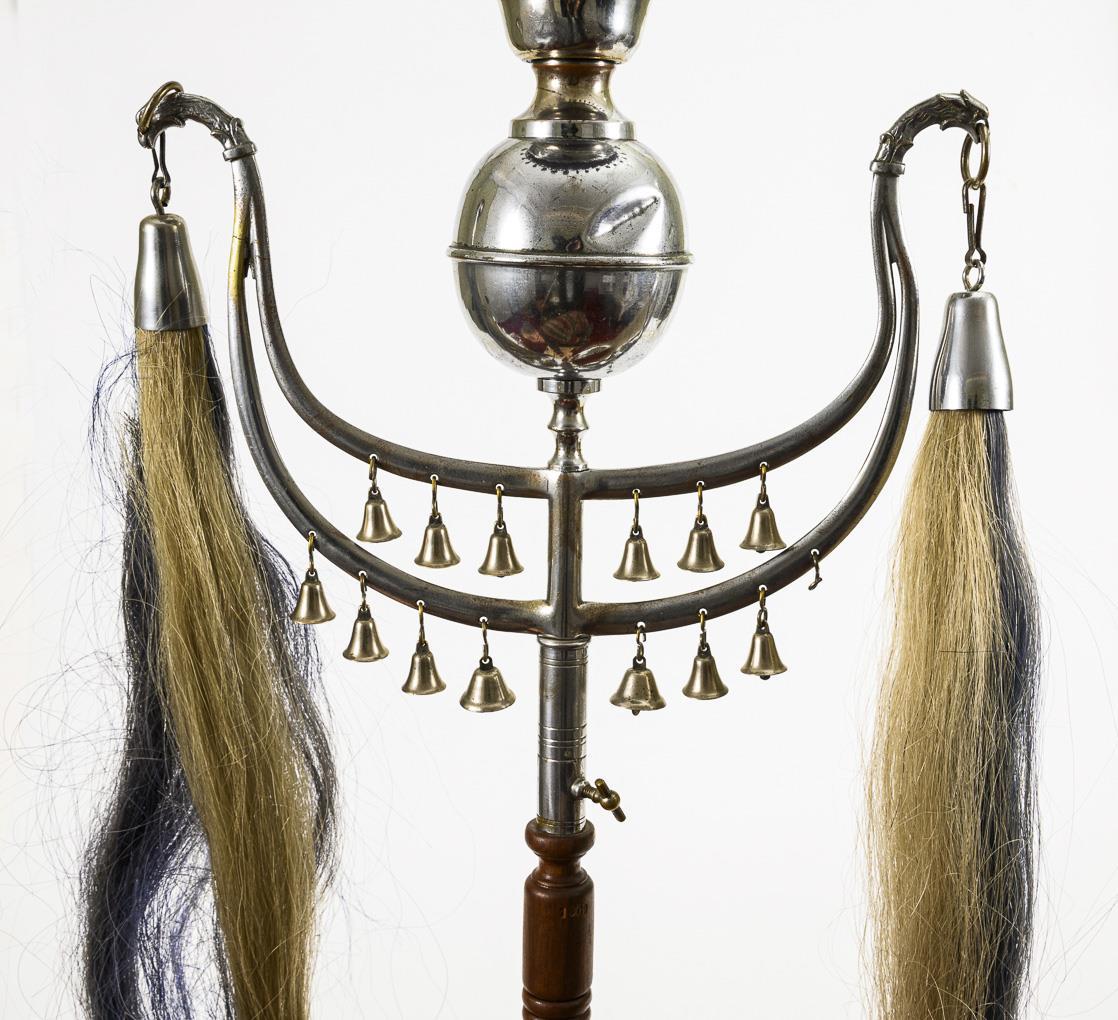 Glockenspiel aus poliertem Blech mit unterschiedlich großen Glocken. Innenseiten rot lackiert. Zweifarbige Roßhaarschweife und Holzschaft. Nodus mit Delle, Alters- und Gebrauchsspuren.