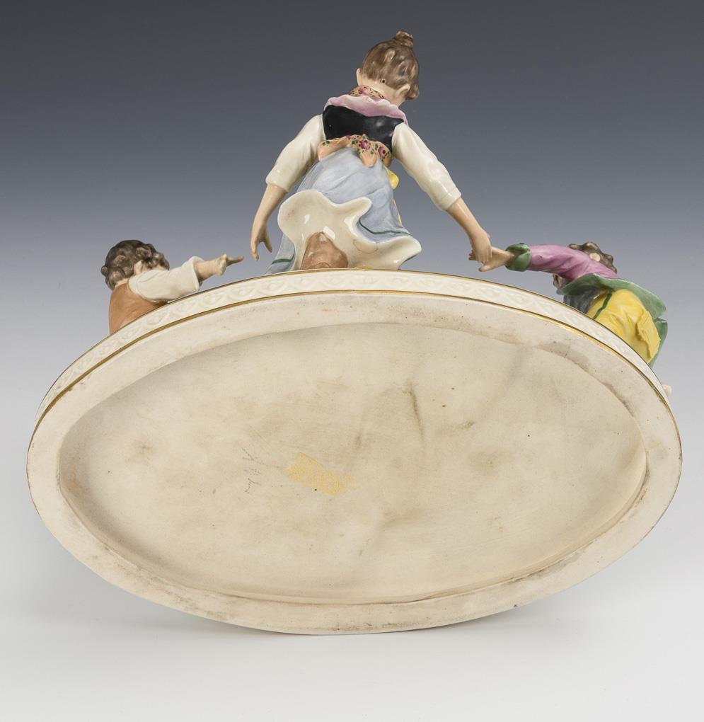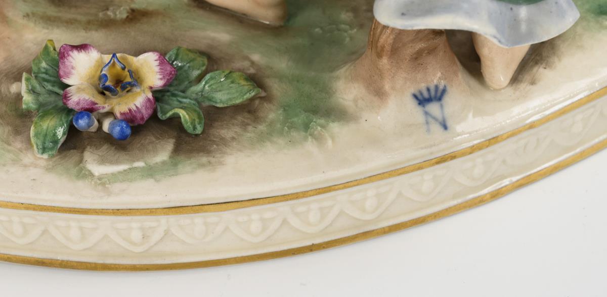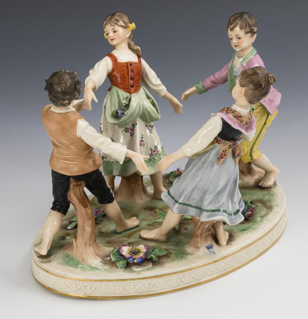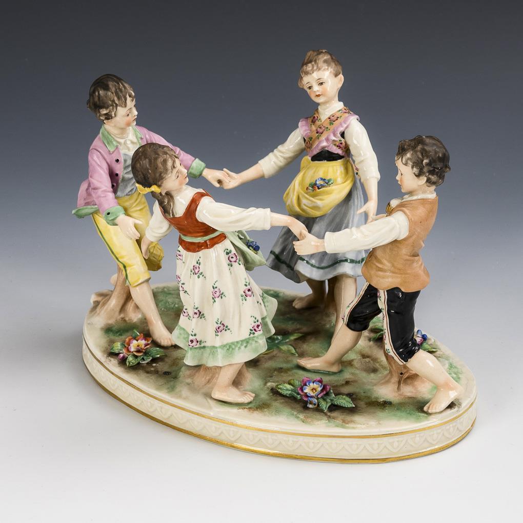 Vier auf einem blütenbelegten Sockel einen Reigen tanzende Kinder. Blüten und Blätter teils bestoßen.