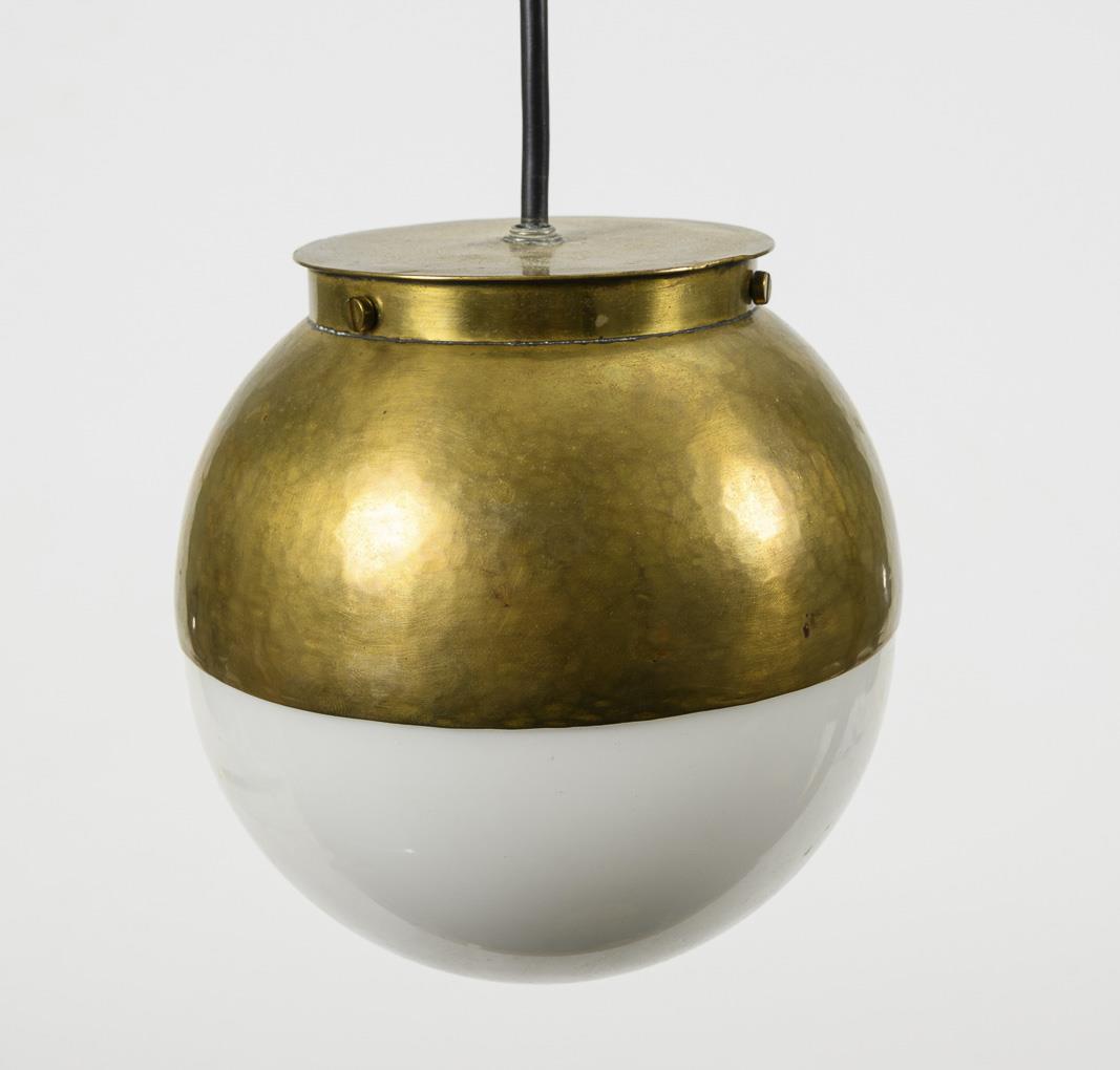 Messingblech, ebonisiertes Holz, weißes Glas. H 189 cm, B 40 cm.