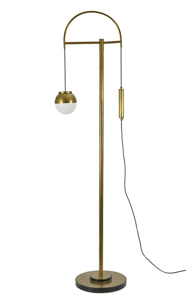 Gestufter Rundfuß im Kontrast von schwarzem Holz und Messingglanz. Am Stabschaft halbkreisförmiges Umlenkrohr für das verschiebbare Kabel mit Kugelschirm und bleigefülltem Gegengewicht. Kabel mit Schutzkontaktstecker und Fußschalter. Einige leichte Alters-/Gebrauchsspuren. Jünger verkabelt, funktioniert.