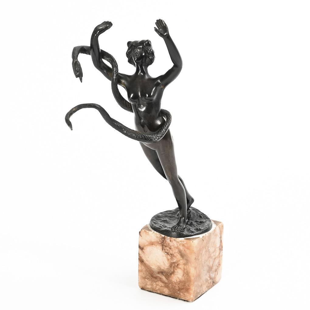 Vorwärts schreitender Akt einer Frau mit erhobenen Armen, um deren Leib sich eine Schlange windet. Schiefstand, Patina teils berieben, kleine Abplatzer am Marmor.