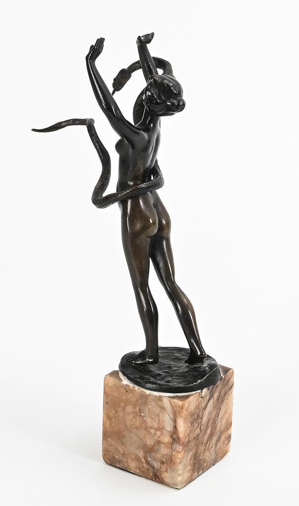 Vorwärts schreitender Akt einer Frau mit erhobenen Armen, um deren Leib sich eine Schlange windet. Schiefstand, Patina teils berieben, kleine Abplatzer am Marmor.