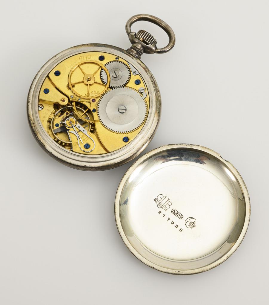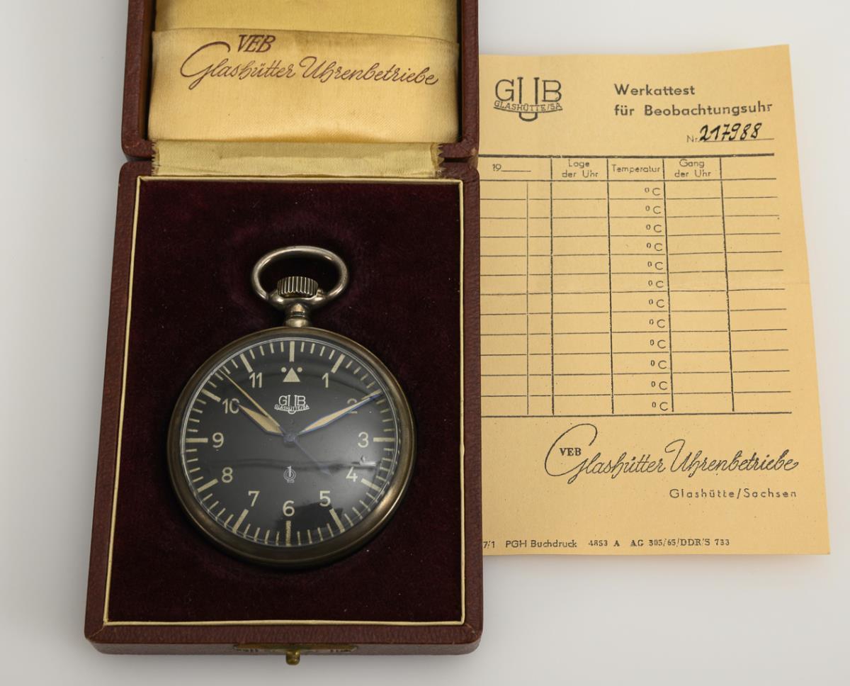Silberne Beobachtungsuhr in Etui. Marke GUB / VEB MECHANIK GLASHÜTTER UHRENBETRIEBE.