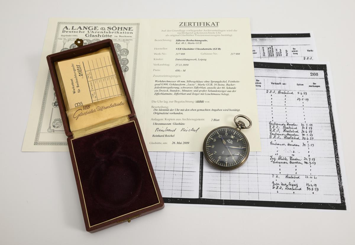 Mit rotem GUB-Etui, Zertifikat des Uhrenmuseums Glashütte vom 26. Mai 2009 und 2 Kopien aus dem Verkaufsbuch.