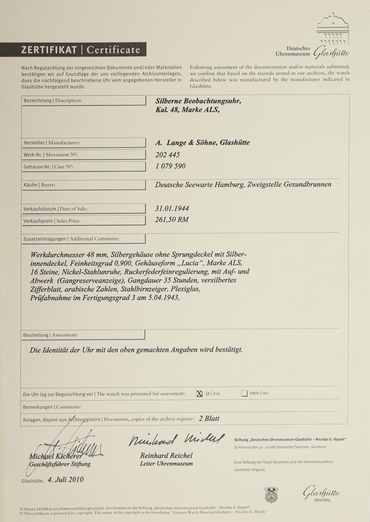 Am 31.01.1944 an die Deutsche Seewarte Hamburg, Zweigstelle Gesundbrunnen verkauft. Gehäuse-Nr. 1079590, Werk-Nr. 202445.
