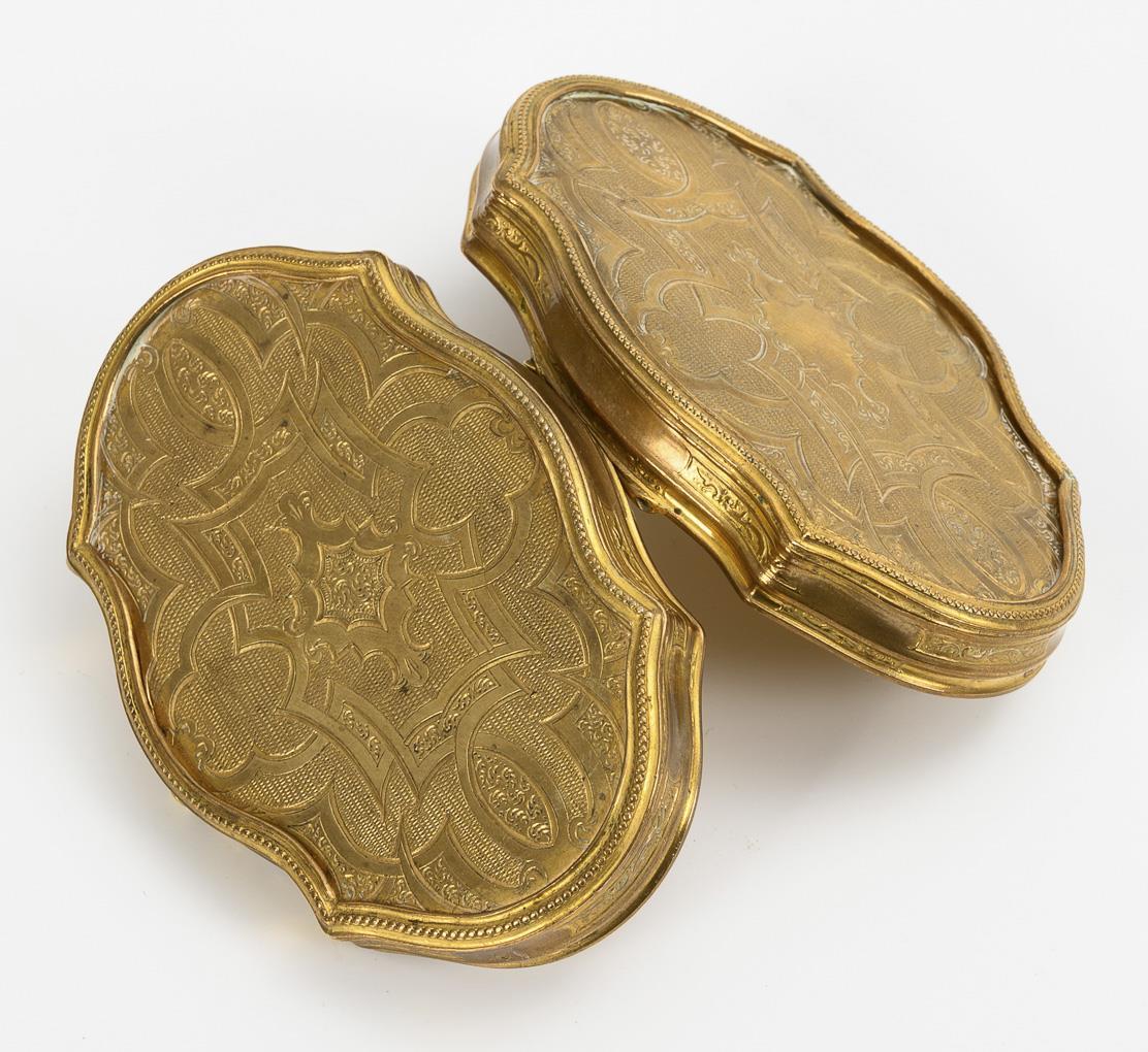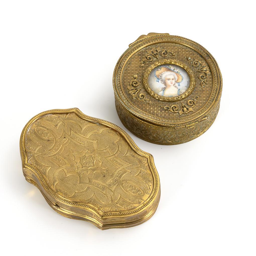 "Bornel" bezeichneter Miniatur unter Verglasung auf dem Scharnierdeckel der runden Dose mit feinem Reliefornament. / Vergoldete Dose in barock geschwungener Form mit feiner "Gravur". Minimal verbeult.