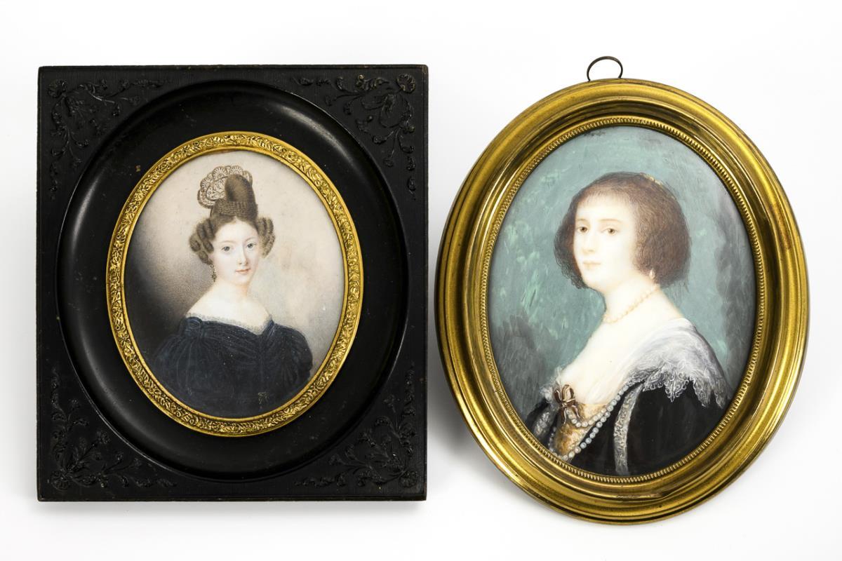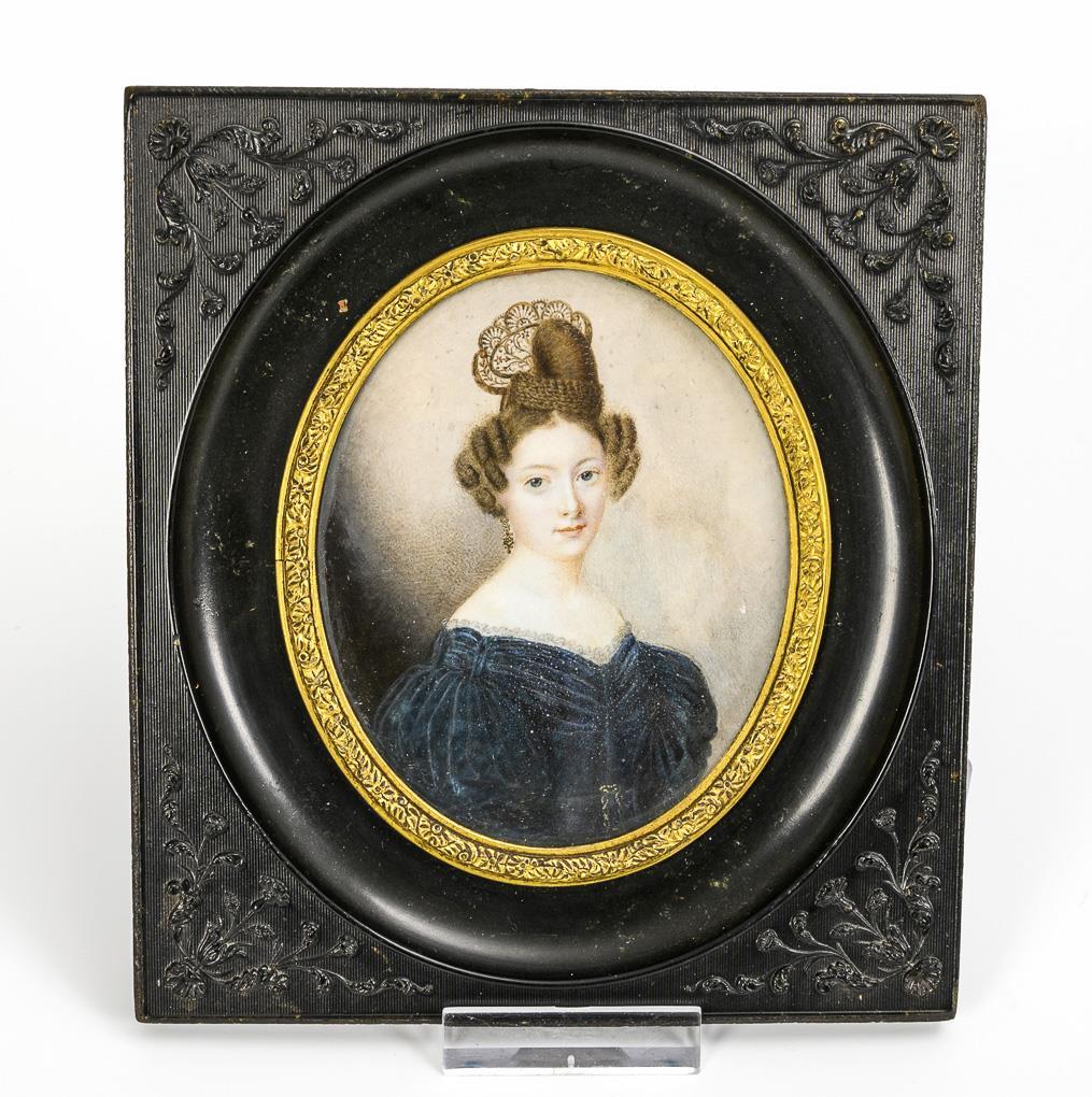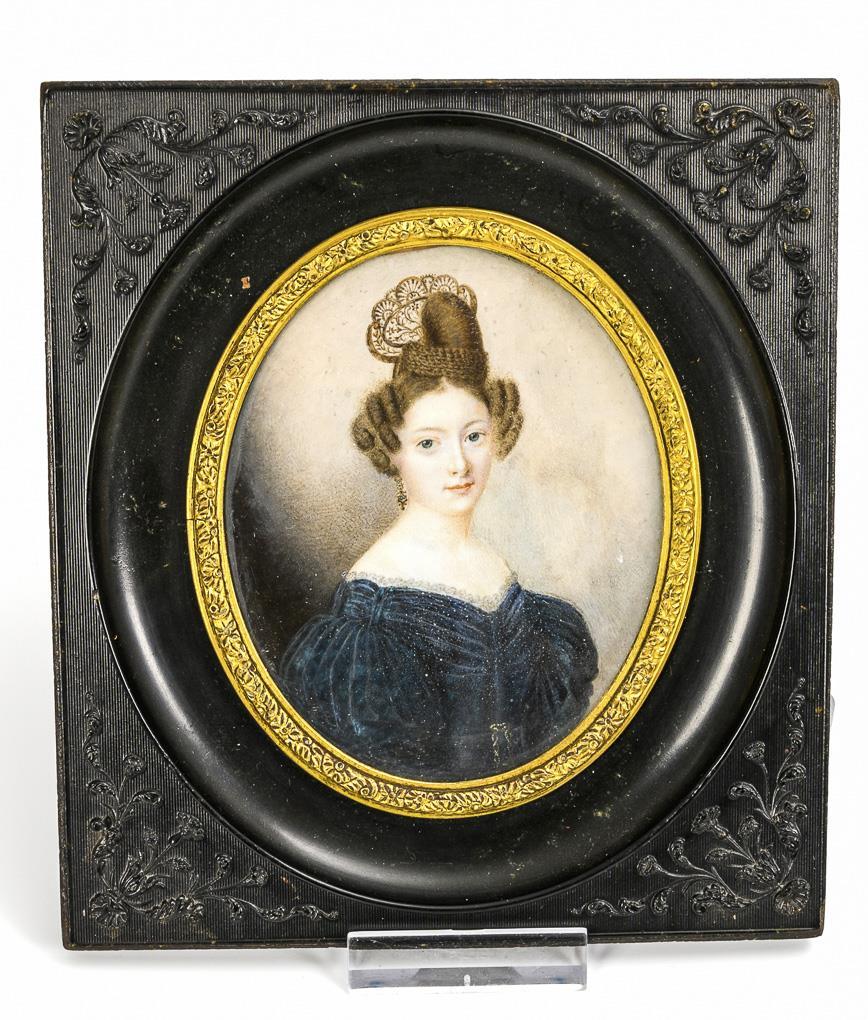 Fein gemalte Biedermeier-Dame im blauen Kleid mit kunstvoller Frisur. Verglaste Messingleiste im Union-Case-Rahmen. / Verso betiteltes Bildnis der Maria Stuart im verglasten Messingrahmen. Minimale Farbabsplitterungen am Biedermeier-Bildnis.