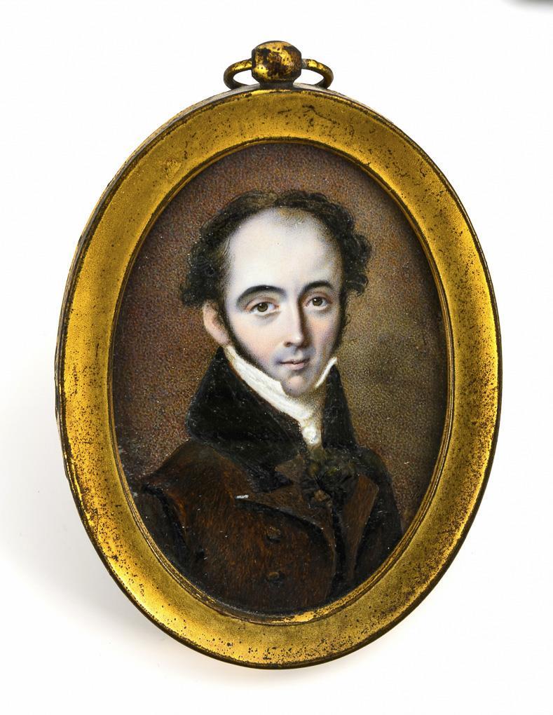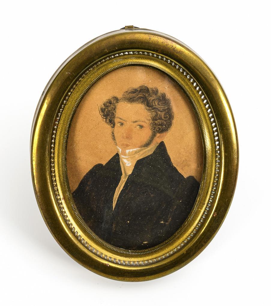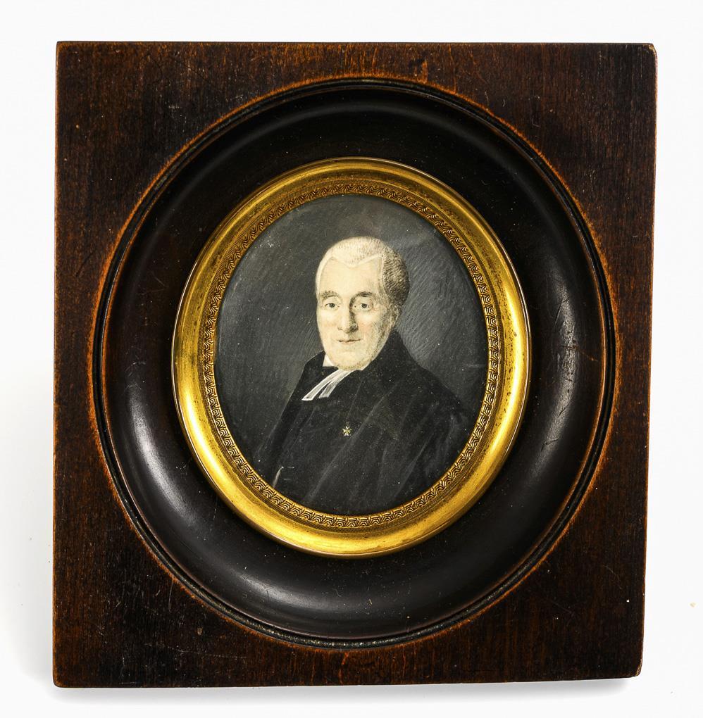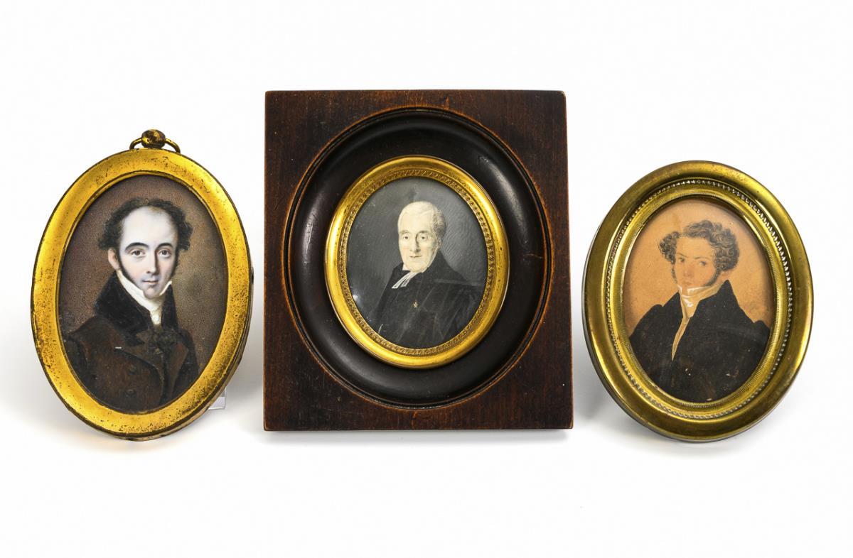 Sehr fein gemaltes Bildnis eines Herren mit hoher Stirn im verglasten Messingrahmen. / Junger Mann im verglasten Messingrahmen. / Älterer Mann im Talar mit Tatzenkreuz-Orden; verso "W. Bogert 1828" bezeichnet. 2x geringe Farbabsplitterungen, 1x gebräunt.