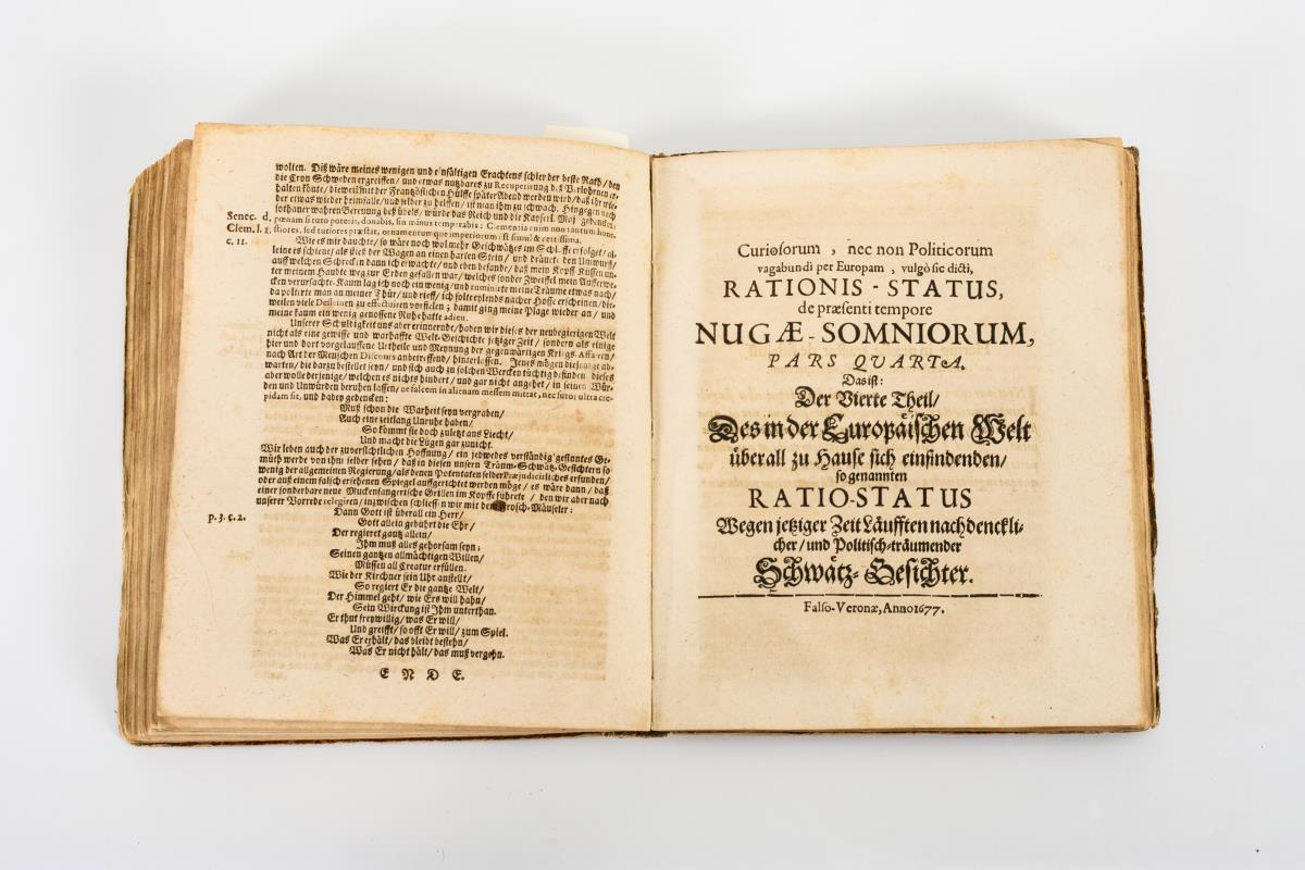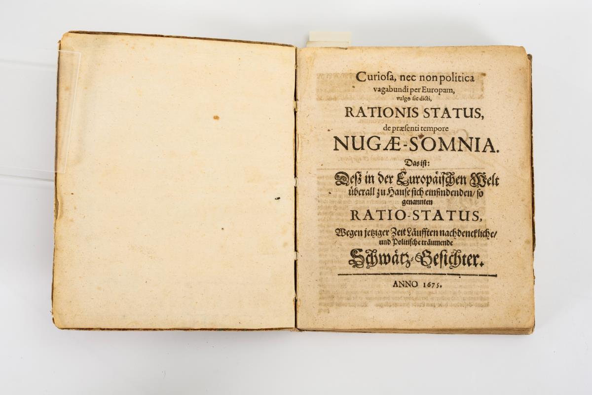 "Curiosa, nec non politica vagabundi per Europam, vulgo sic dicti, Rationis Status, de praesenti tempore Nugae-Somnia. Das ist: Deß in der Europäischen Welt überall zu Hause sich einfindenden so genannten Ratio-Status, Wegen jetziger Zeit Läufften nach denckliche und Politische träumende Schwätz-Gesichter".