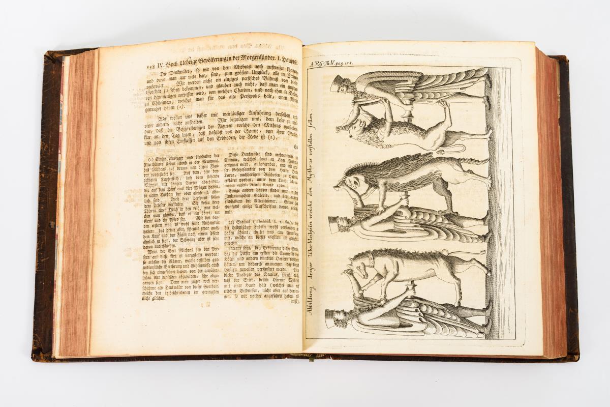 Titelkupfer, Titel, (10), 500, "Von der Zeitbestimmung der Geschichten": 86, 204(Register) Seiten und 2 Landkarten. Ganzledereinband mit Goldprägung und Rotschnitt. Exlibris im Einbanddeckel herausgerissen.