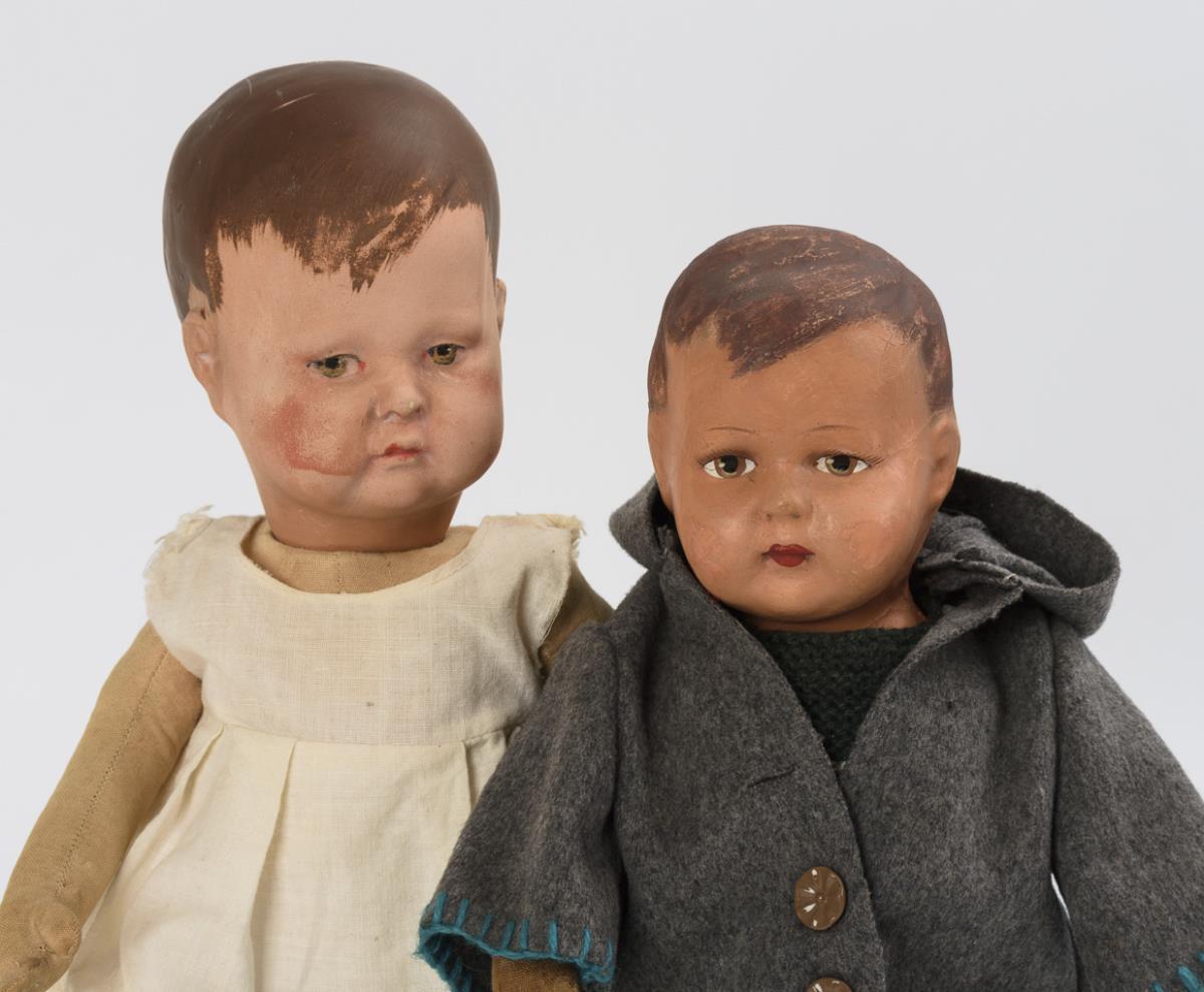 1x mit bemaltem Kurbelkopf und Stoffkörper mit Scheibengelenken. In weißem Unterkleid. H 36 cm. / 1x mit Brustkopf aus Pappmaché und Stoffkörper mit gesplinteten Gliedern. In grauem Filzmantel. H 33 cm. Bespielt, mit Altersspuren und Bereibungen.