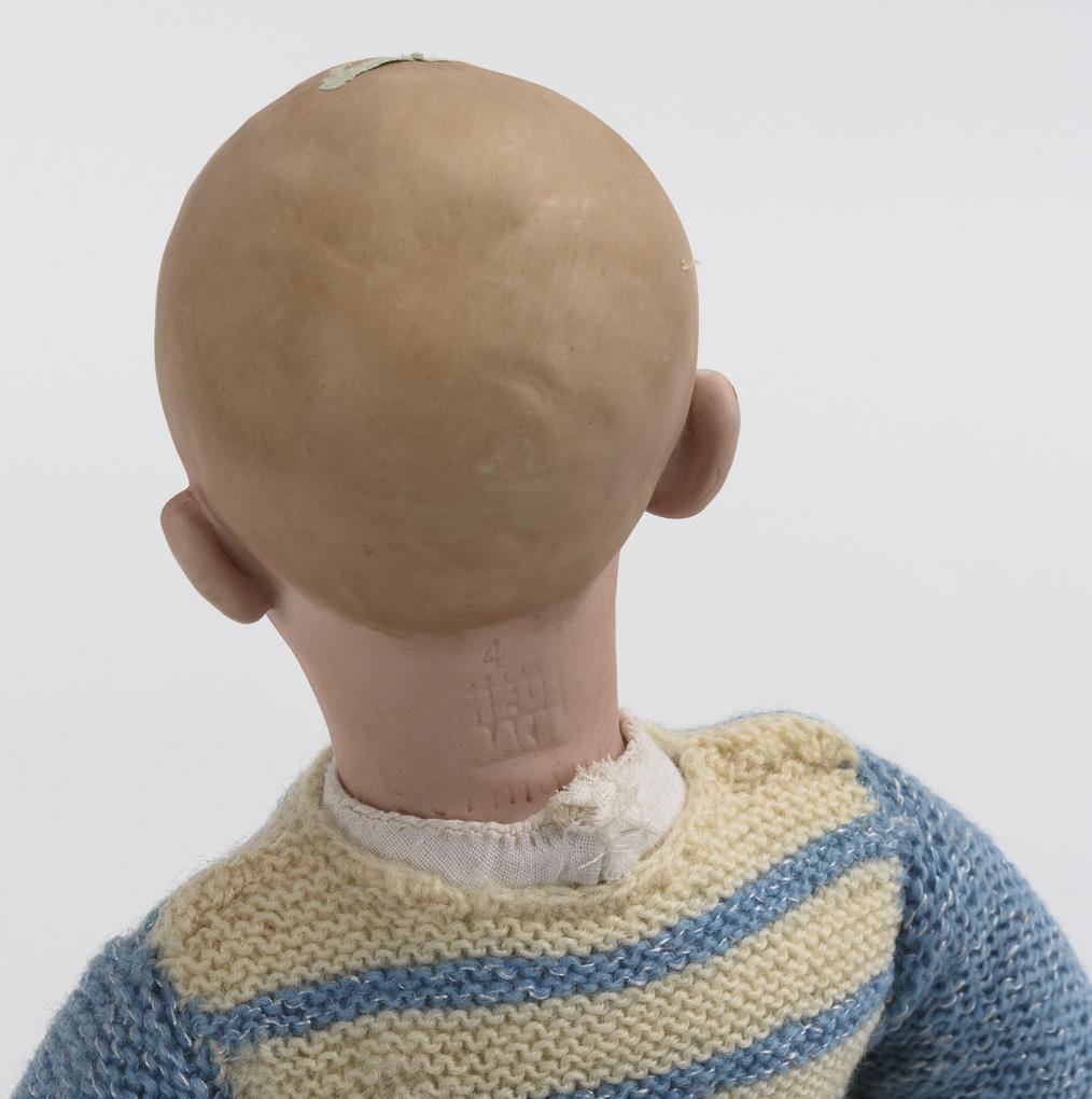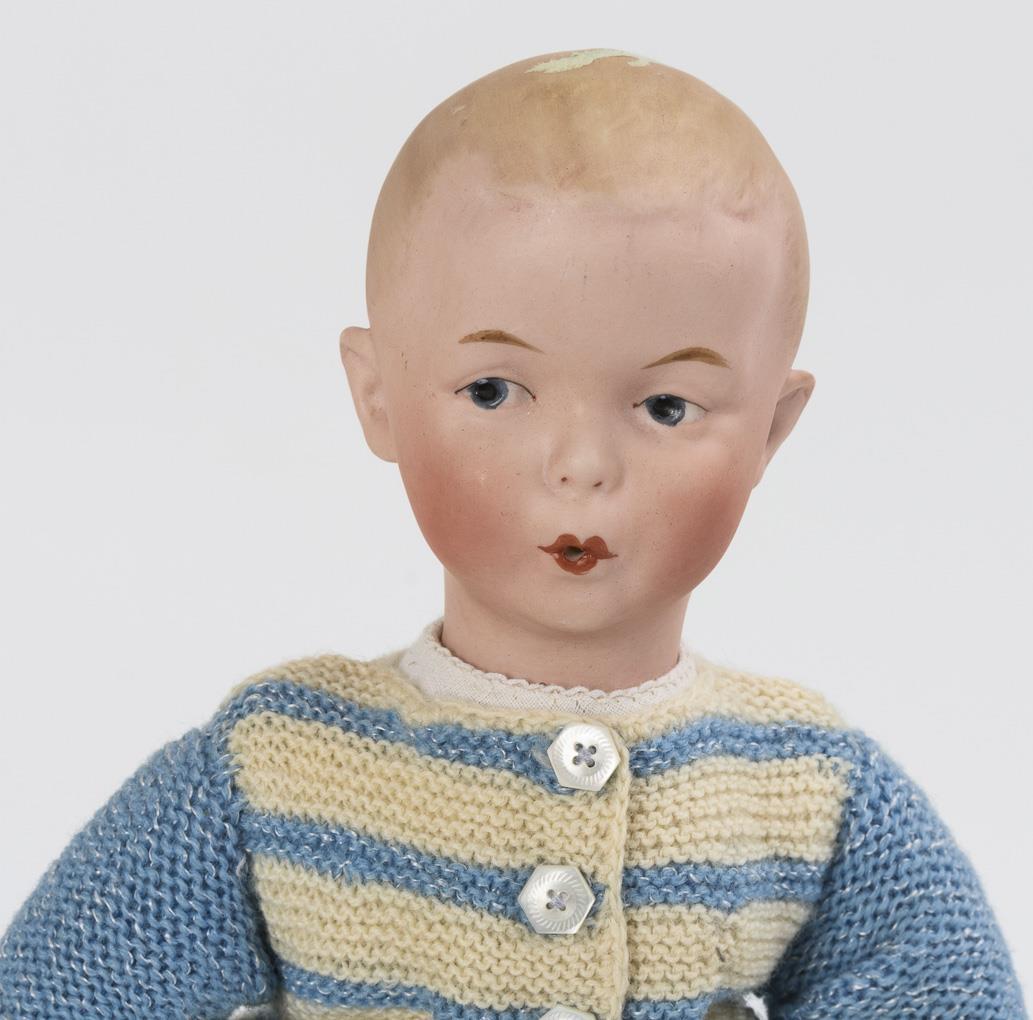 Einbindekopf mit gemalten blauen Augen, modellierten Haaren und zum Pfeifen gespitzten Lippen mit Öffnung. Neuer Stoffkörper mit Unterarmen und Beinen aus Biskuit. Hellblaue Strickkleidung, Mütze und Handschuhe. Keine Defekte sichtbar.